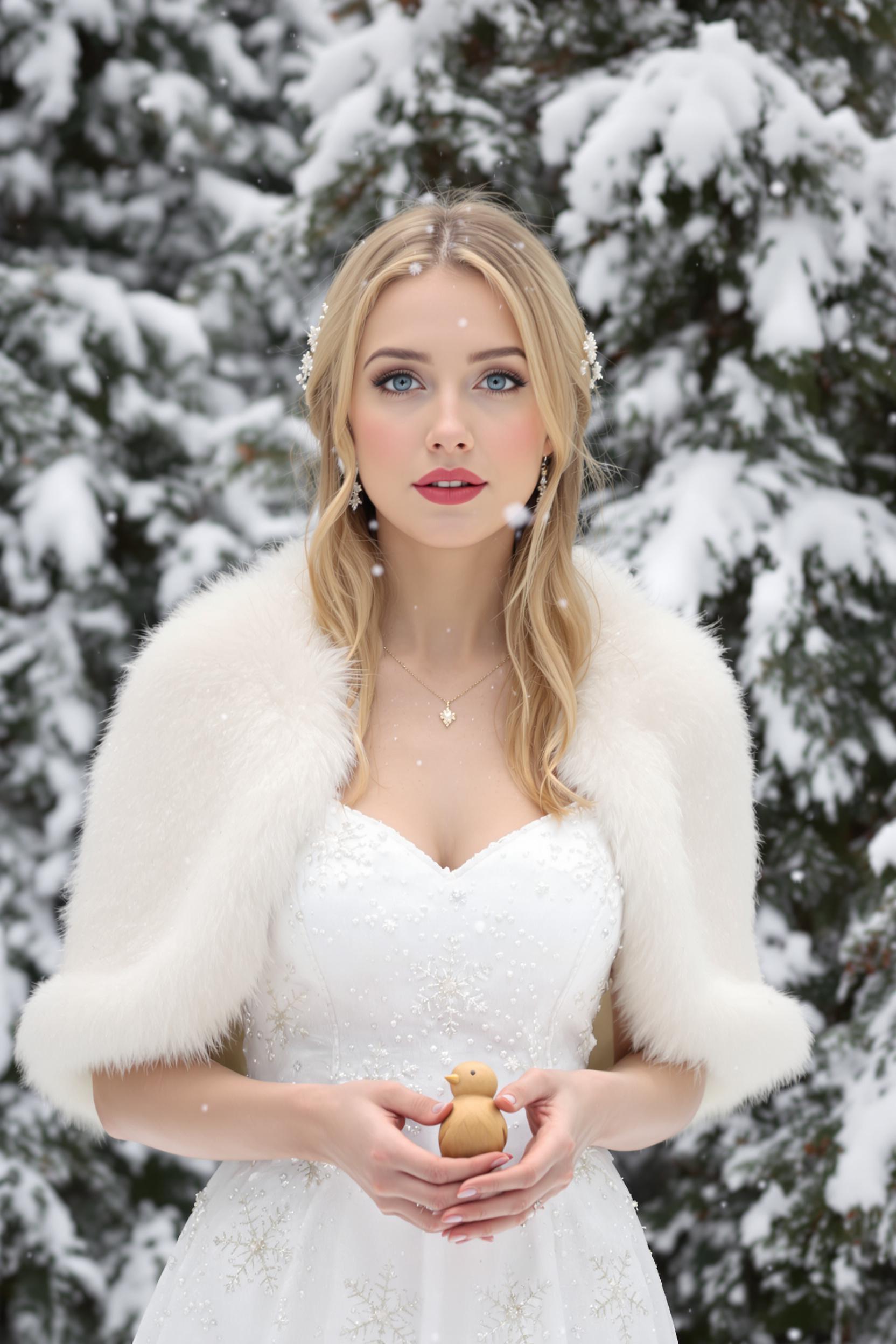 Девушка в белом сарафане со снежинками и в меховой накидке стоит среди заснеженных елей, держит в руках небольшую резную птицу из дерева, смотрит прямо в камеру, вокруг падает лёгкий снег, атмосфера волшебной зимней сказки.