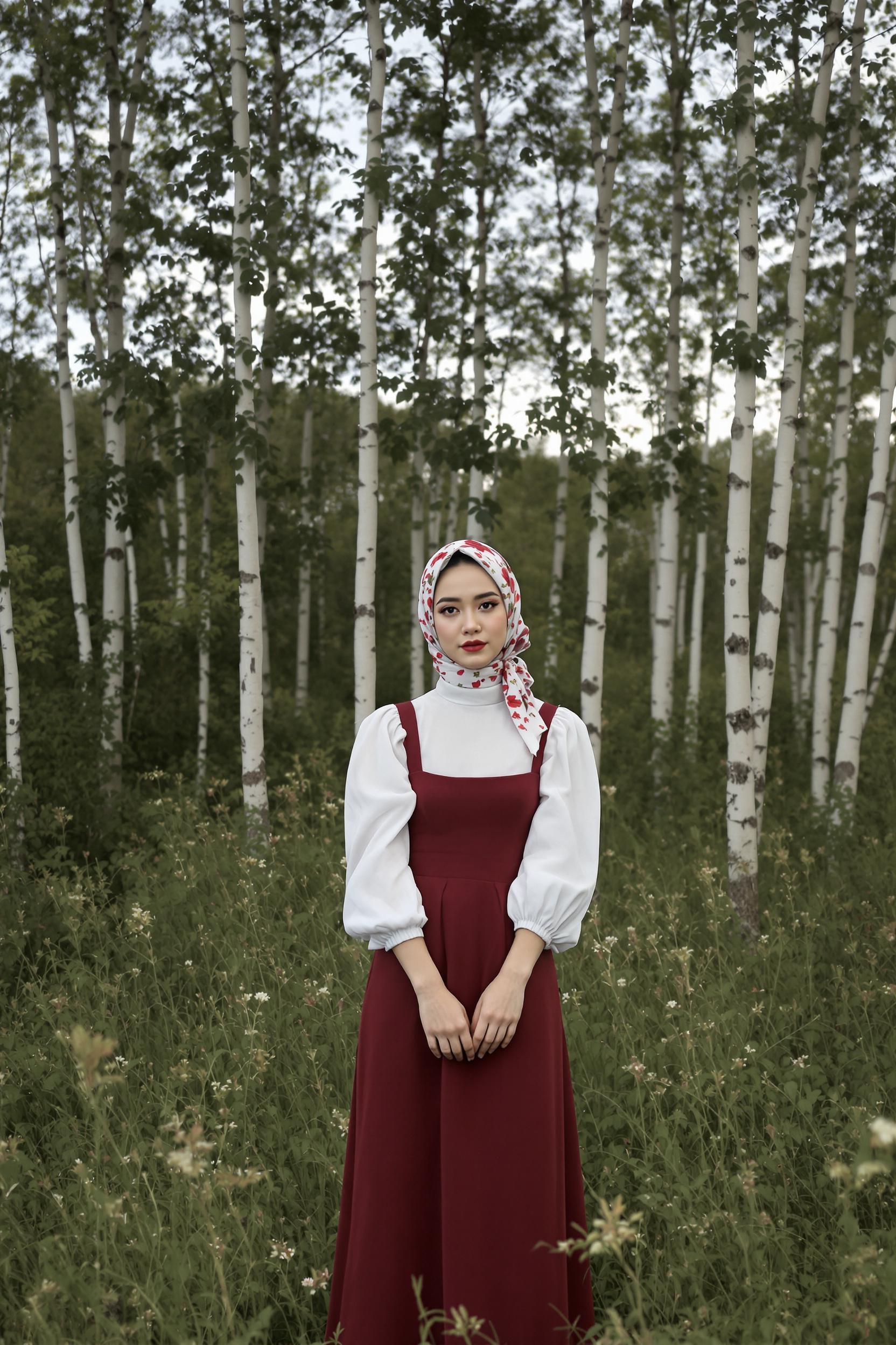 Девушка в бордовом сарафане до щиколоток, белая рубаха с пышными рукавами, волосы собраны под платок с цветочным узором, стоит на лугу у берез, держит руки перед собой, смотрит в камеру, минимализм, облачный вечер.