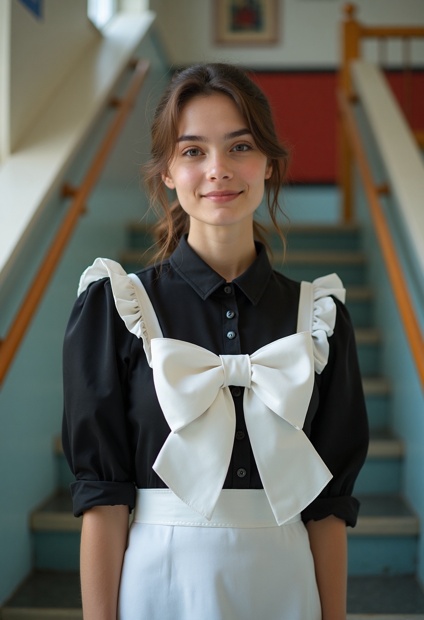 Девушка в чёрном платье и белом фартуке с огромным белым бантом стоит на лестнице школы, позади виден праздничный плакат 'Последний звонок'. Она смотрит в камеру, улыбаясь. Крупный план.
