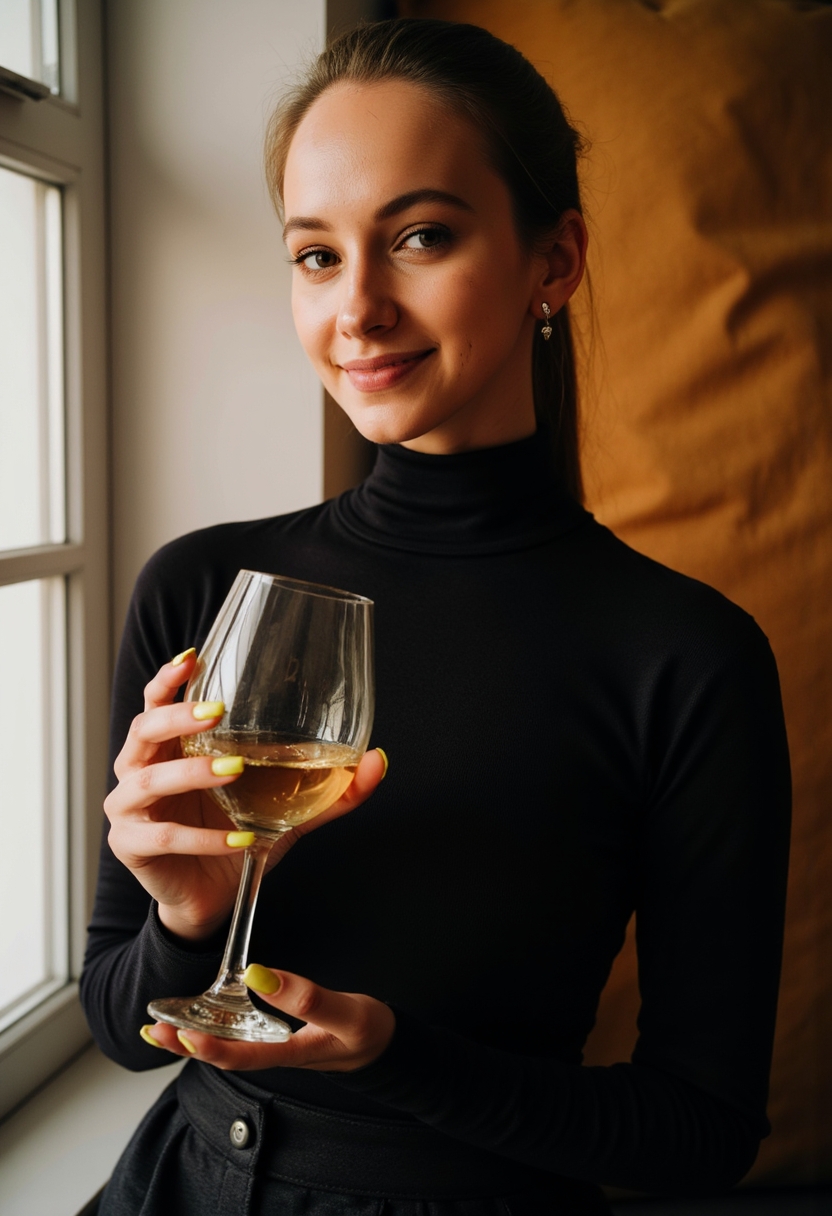 Девушка в черной водолазке и юбке стоит у большого окна с переплетом, держит в руках бокал вина, теплый свет падает на её лицо, она смотрит прямо в камеру