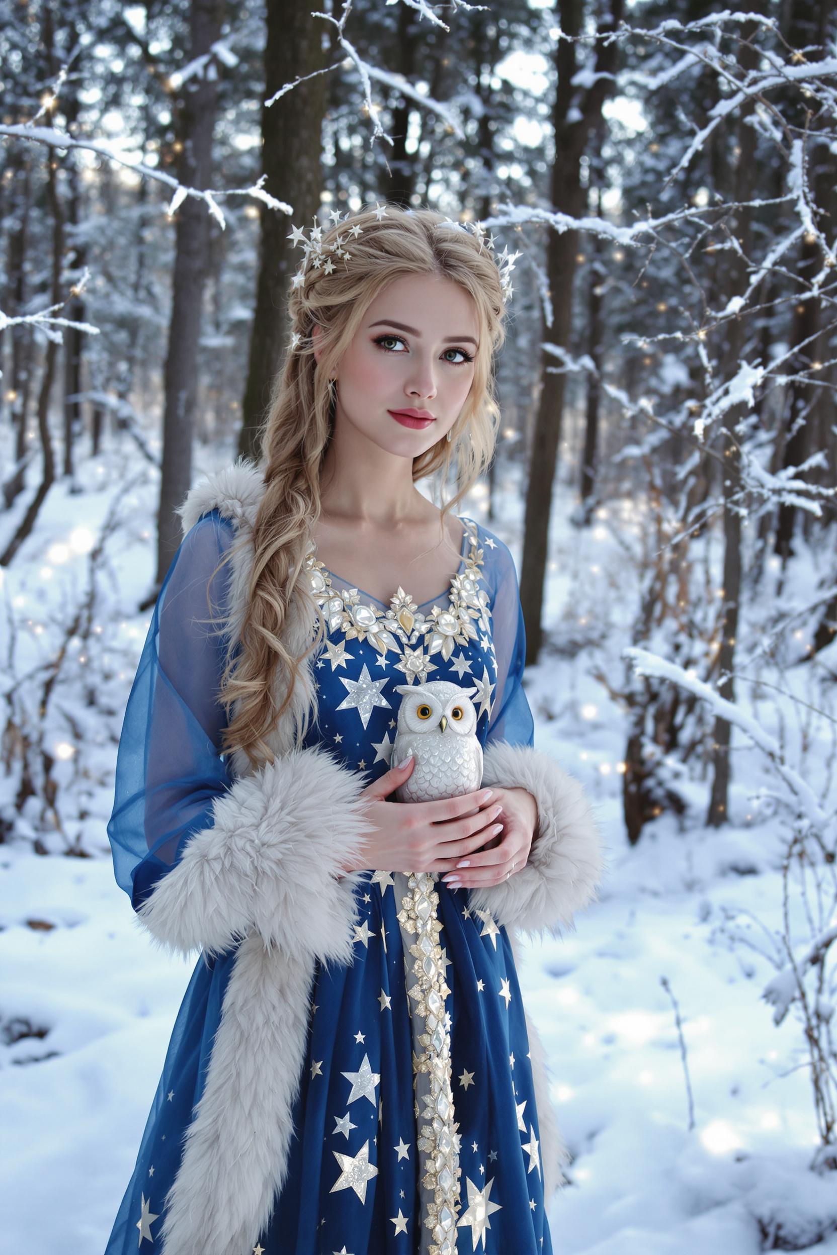 Девушка в длинном синем сарафане с вышитыми звездами и меховой опушкой стоит у заснеженной опушки леса, держит в руках небольшого серебристого филина, смотрит прямо в камеру, вокруг мерцает лёгкое волшебное сияние.