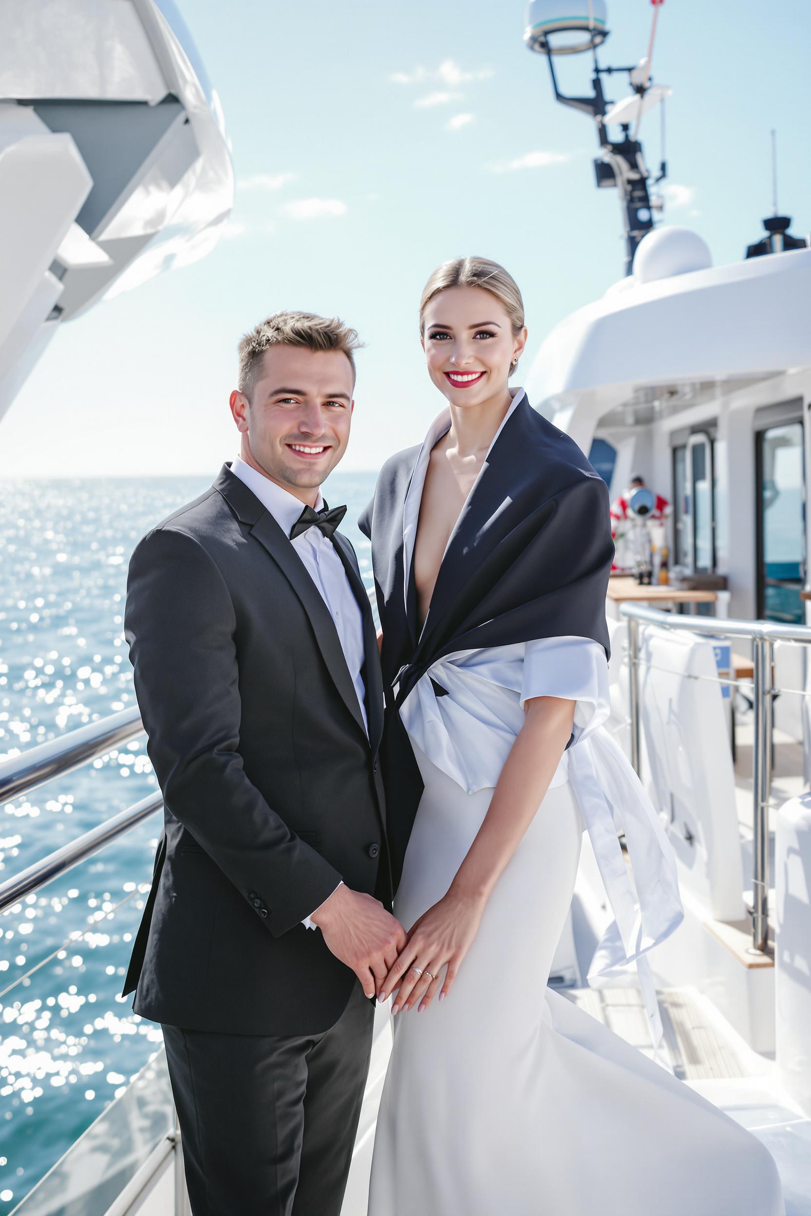 Девушка в элегантном платье и парень в стильном костюме стоят на палубе современной яхты у перил, между ними легкое прикосновение рук, оба смотрят в камеру с радостными улыбками, вокруг яркое солнечное небо и блеск воды.