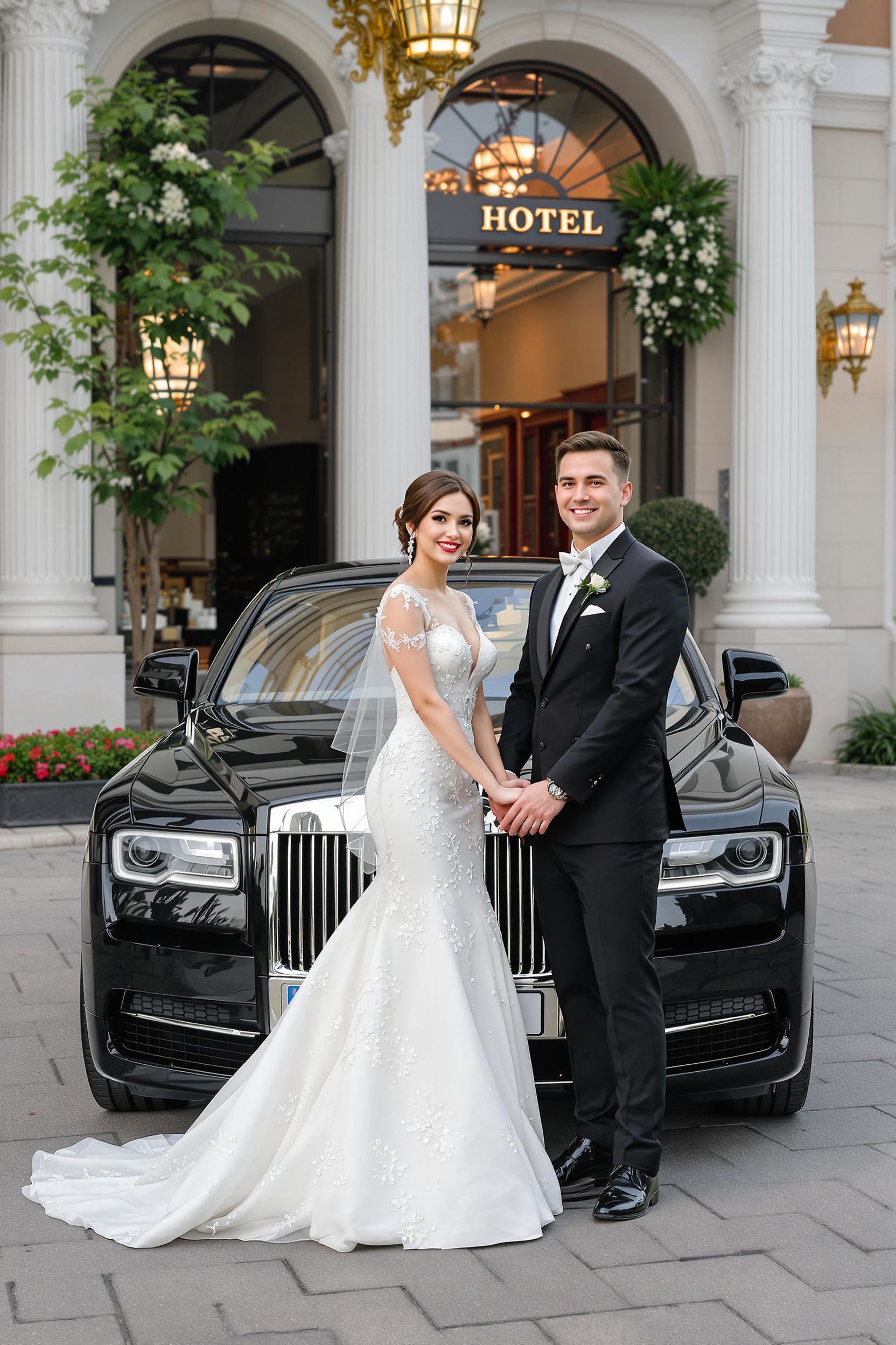 Девушка в элегантном свадебном платье и парень в классическом костюме стоят у шикарного черного автомобиля на фоне роскошного отеля, оба смотрят в объектив, держатся за руки, на их лицах счастливая улыбка, деликатный рассеянный свет.