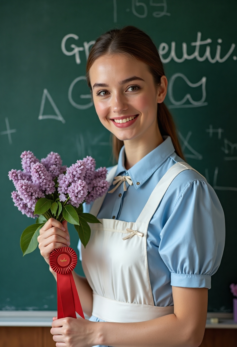 Примерить образ на себеДевушка в классической школьной форме с белым фартуком и большими белыми бантами стоит у школьной доски, в руках держит букет сирени. Она улыбается в камеру, на груди — красная лента 'Выпускник'. Крупный план, акцент на советской атмосфере.