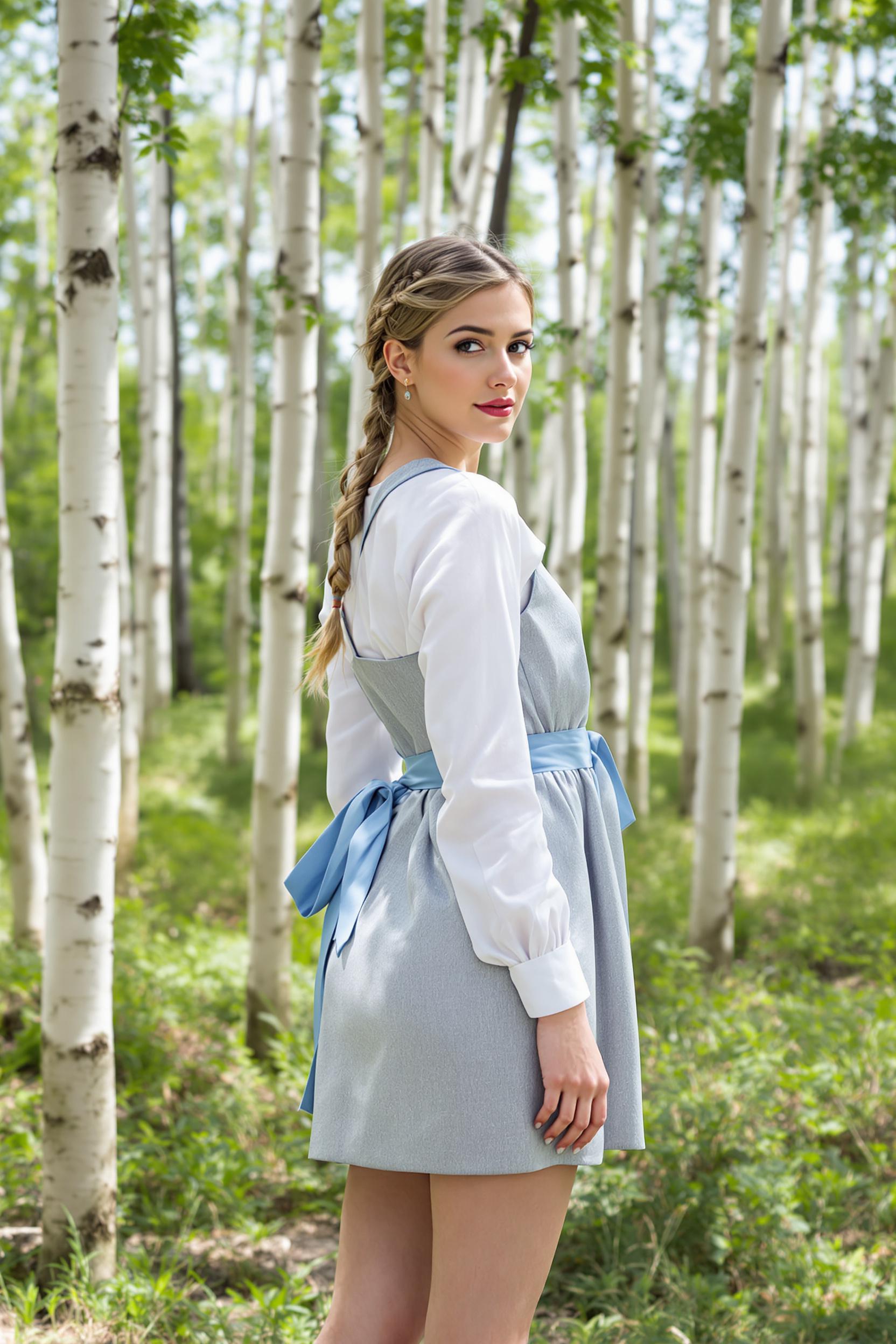 Девушка в коротком светло-сером сарафане с широкой синей лентой на поясе, белая блуза с длинными рукавами, коса перекинута через плечо, стоит боком к камере среди берёз, обернулась и смотрит в объектив, минимализм, летний полдень, солнечно.