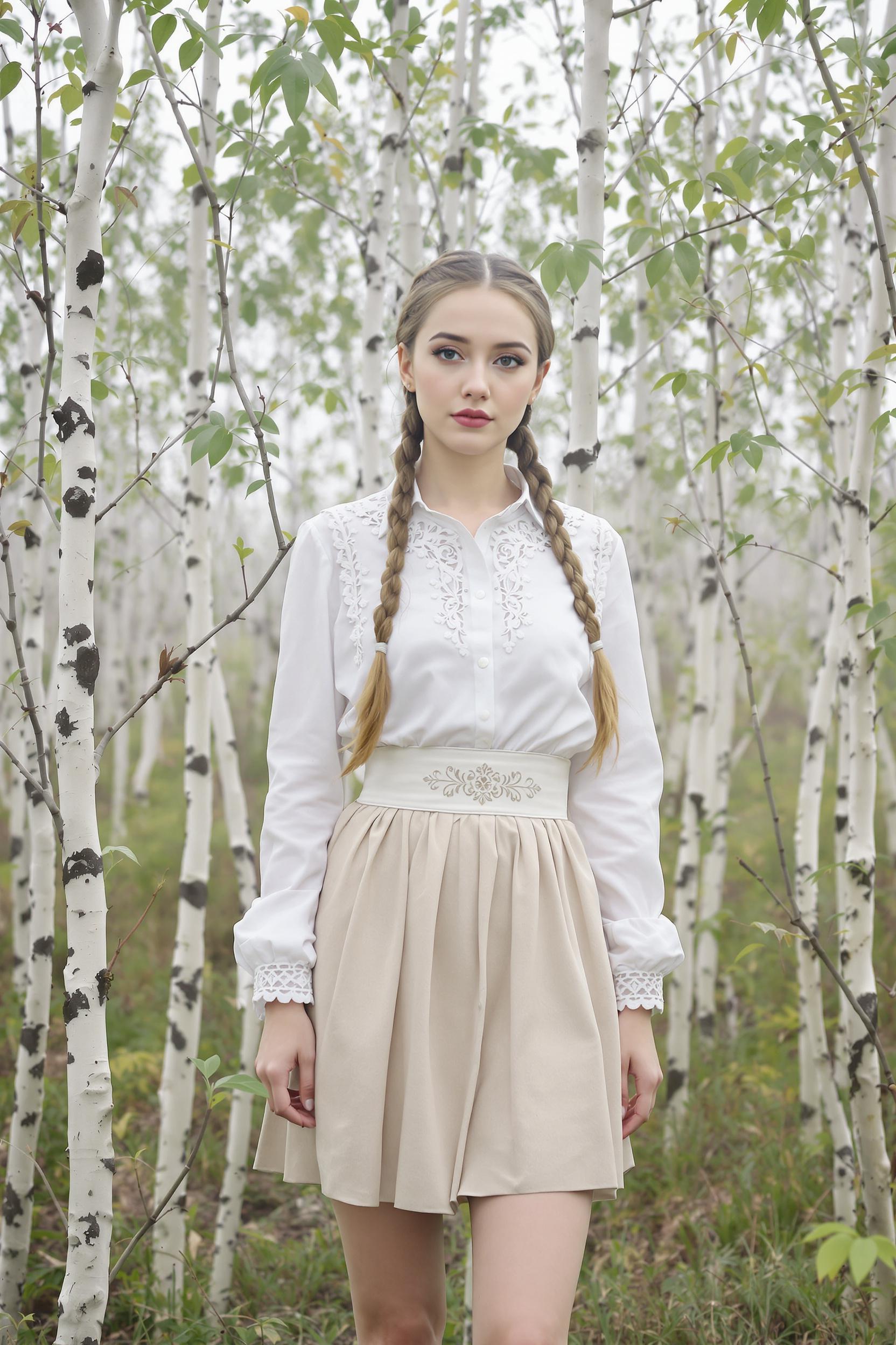 Девушка в короткой светлой юбке и белой рубашке с кружевной отделкой, расшитый пояс на талии, волосы убраны в косу, без головного убора, стоит среди молодых берез, смотрит прямо в камеру, легкий туман, минимализм, традиционные русские мотивы.