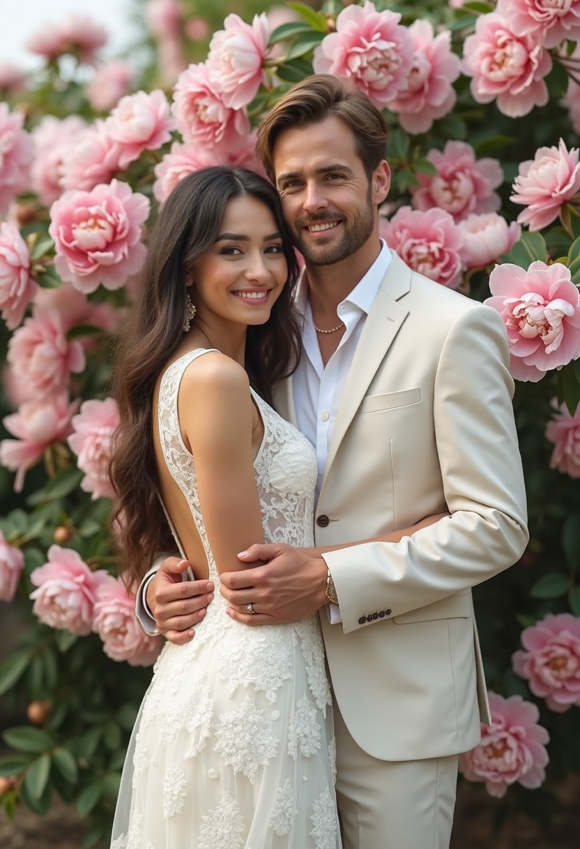 Девушка в кружевном белом платье с открытой спиной, парень в светлом минималистичном костюме и белой рубашке без галстука. Они стоят в обнимку в окружении пышных розовых и белых пионов, оба смотрят прямо в камеру, на лицах радостные улыбки, атмосфера весны.