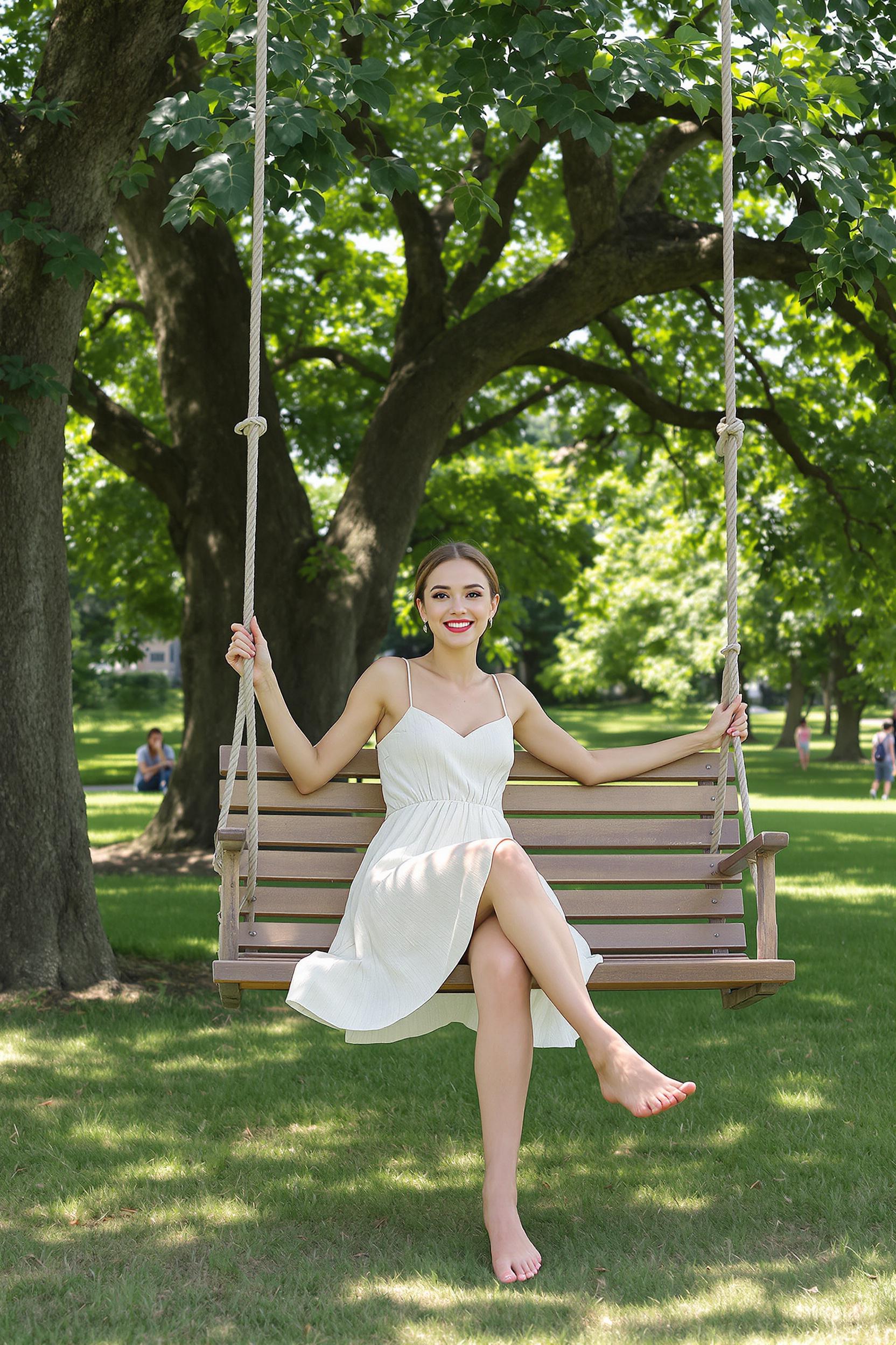 Девушка в лёгком белом сарафане сидит на деревянной качели в тени раскидистого дерева в городском парке, её ноги босиком касаются травы. Она смотрит прямо в камеру с открытой улыбкой, лицо освещено мягким солнечным светом. Средний план, атмосфера лета и беззаботности.