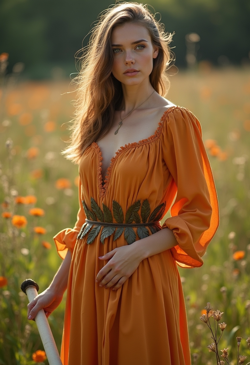Девушка в платье цвета заката с широким поясом из листвы стоит на поляне с цветами, держит древний свиток, смотрит прямо в камеру