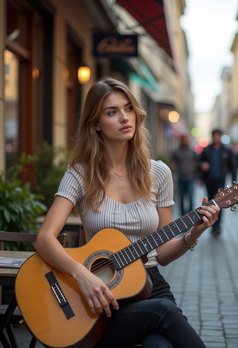 Девушка в полосатом топе сидит на террасе кафе на Arbat Street, держа гитару в руках и наблюдая за весёлым потоком людей.