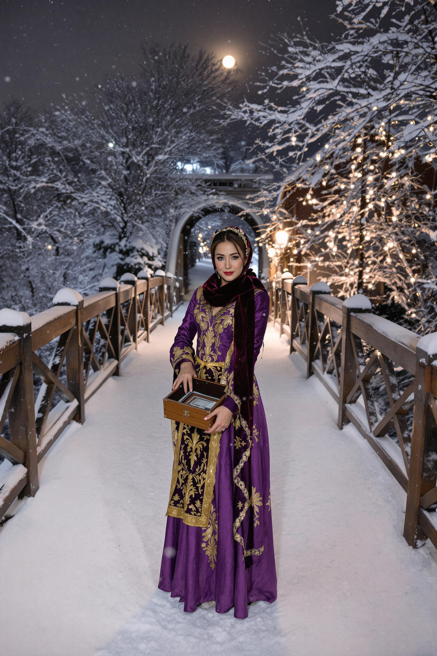 Девушка в пурпурном сарафане с золотой вышивкой и бархатном платке стоит на фоне заснеженного старого моста, держит в руке деревянную шкатулку, смотрит прямо в камеру, вокруг снежная ночь и мерцание луны.