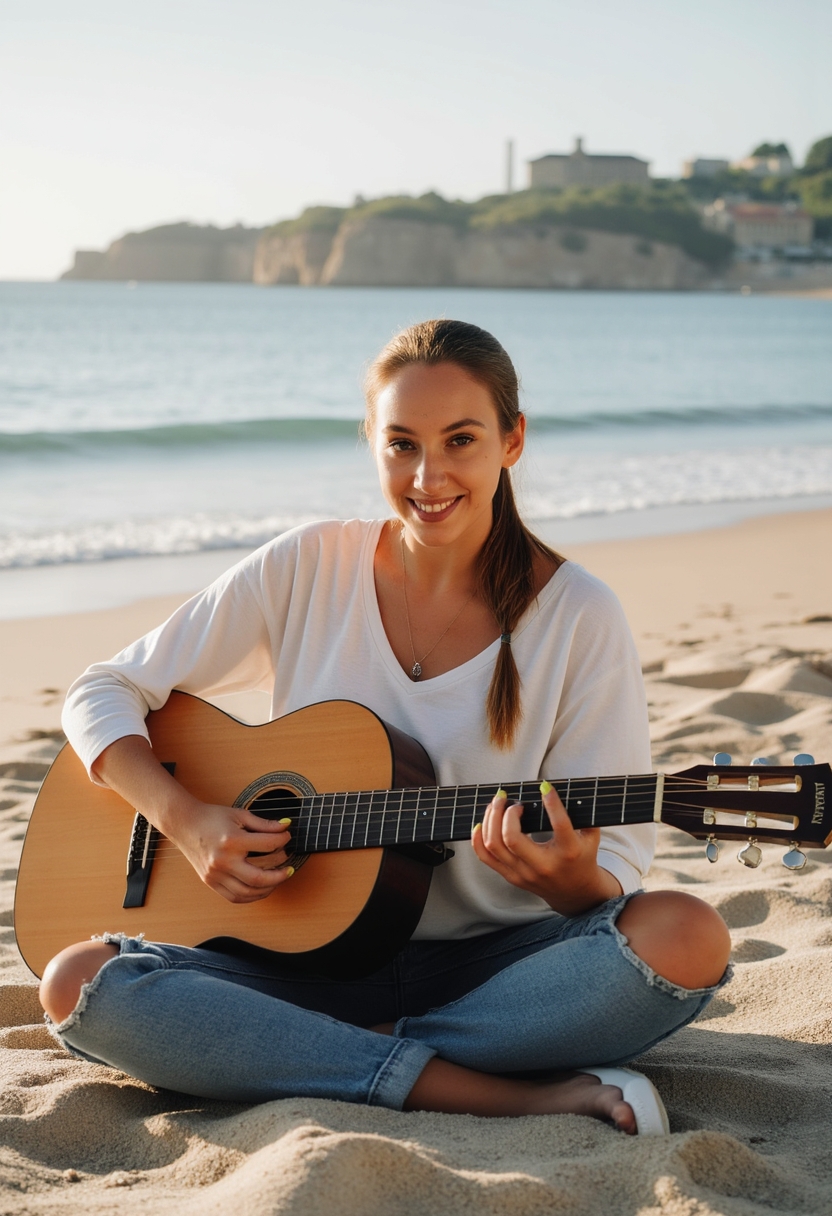 Девушка в рваных джинсах и светлой блузке улыбается, сидя на песке пляжа в Ницце, с гитарой в руках и безмятежным морем на горизонте.