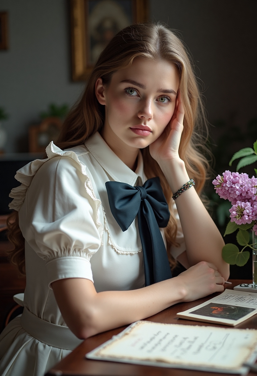 Девушка в школьной форме с белым фартуком и большими бантами сидит за партой, опираясь на локоть и смотря в камеру. Рядом лежит букет сирени и открытка. Крупный план, советский колорит.