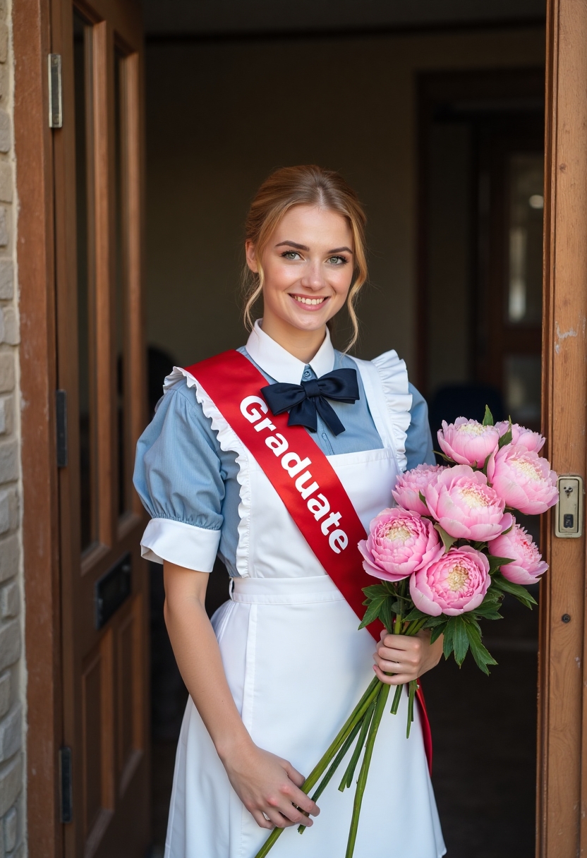 Девушка в школьной форме с белым фартуком и объёмными бантами стоит у парадной двери школы с букетом пионов, улыбаясь прямо в камеру. На груди красная лента 'Выпускник'. Крупный план, акцент на праздничной атмосфере.