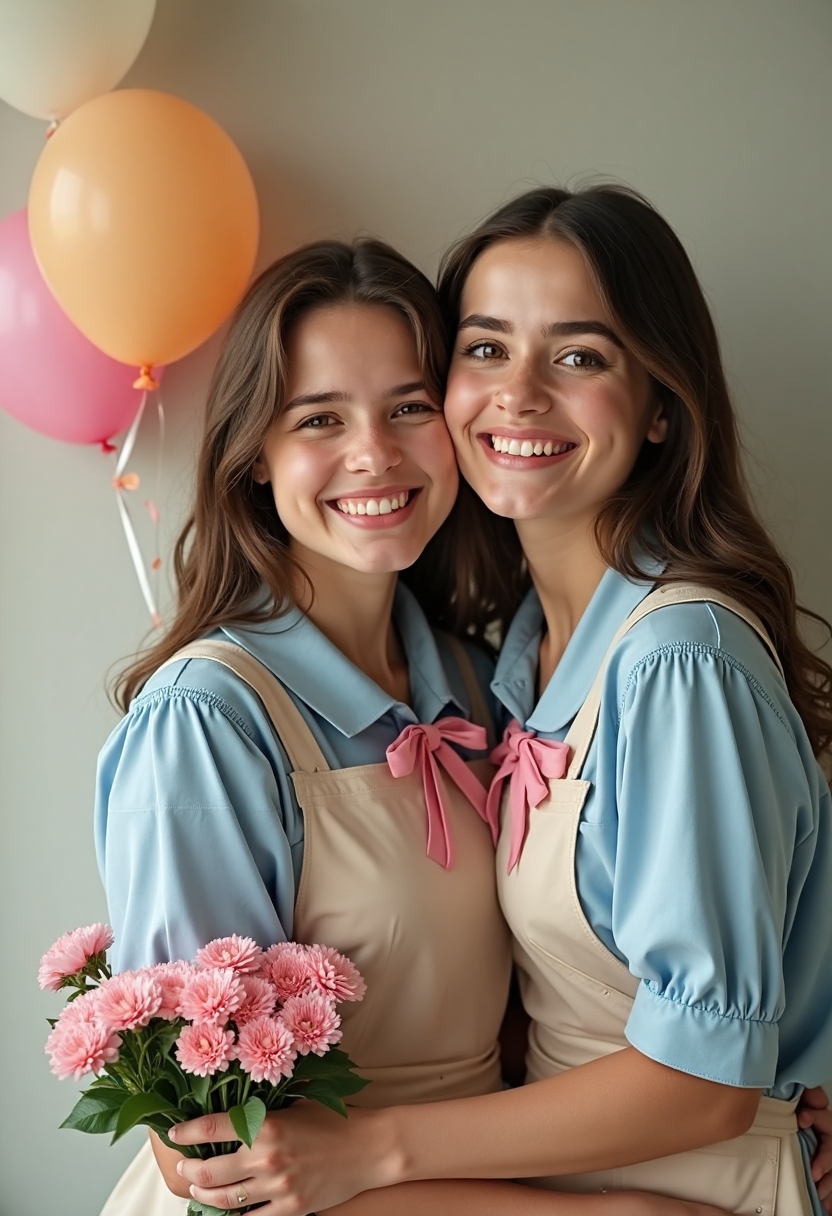 Девушка в школьной форме с фартуком и двумя бантами обнимает подругу, обе смеются и смотрят в камеру. В руках у них букеты и воздушные шары. Крупный план, акцент на дружбе и праздничном настроении.
