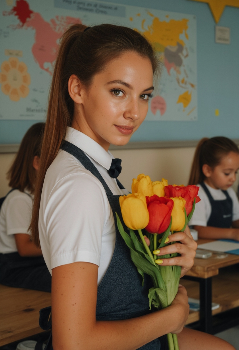 Девушка в строгой школьной форме и фартуке держит букет тюльпанов и смотрит в камеру через плечо, волосы собраны в два пышных банта. Позади украшенный школьный класс. Крупный план.