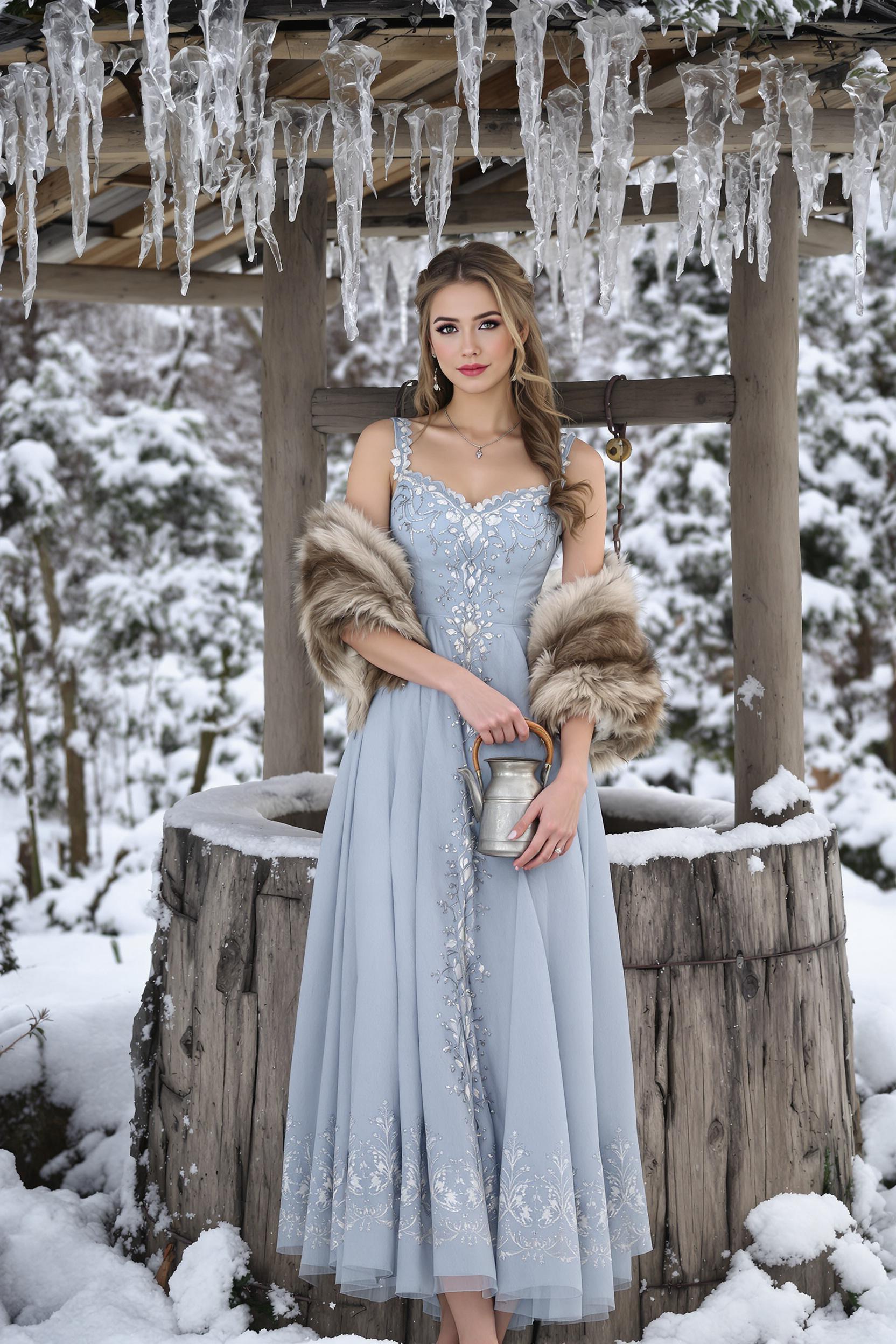 Девушка в светло-голубом сарафане с серебряной нитью и меховой шалью стоит у старого деревянного колодца, держит в руках оловянный кувшин, смотрит прямо в камеру, вокруг — заснеженные деревья и хрустальные сосульки.