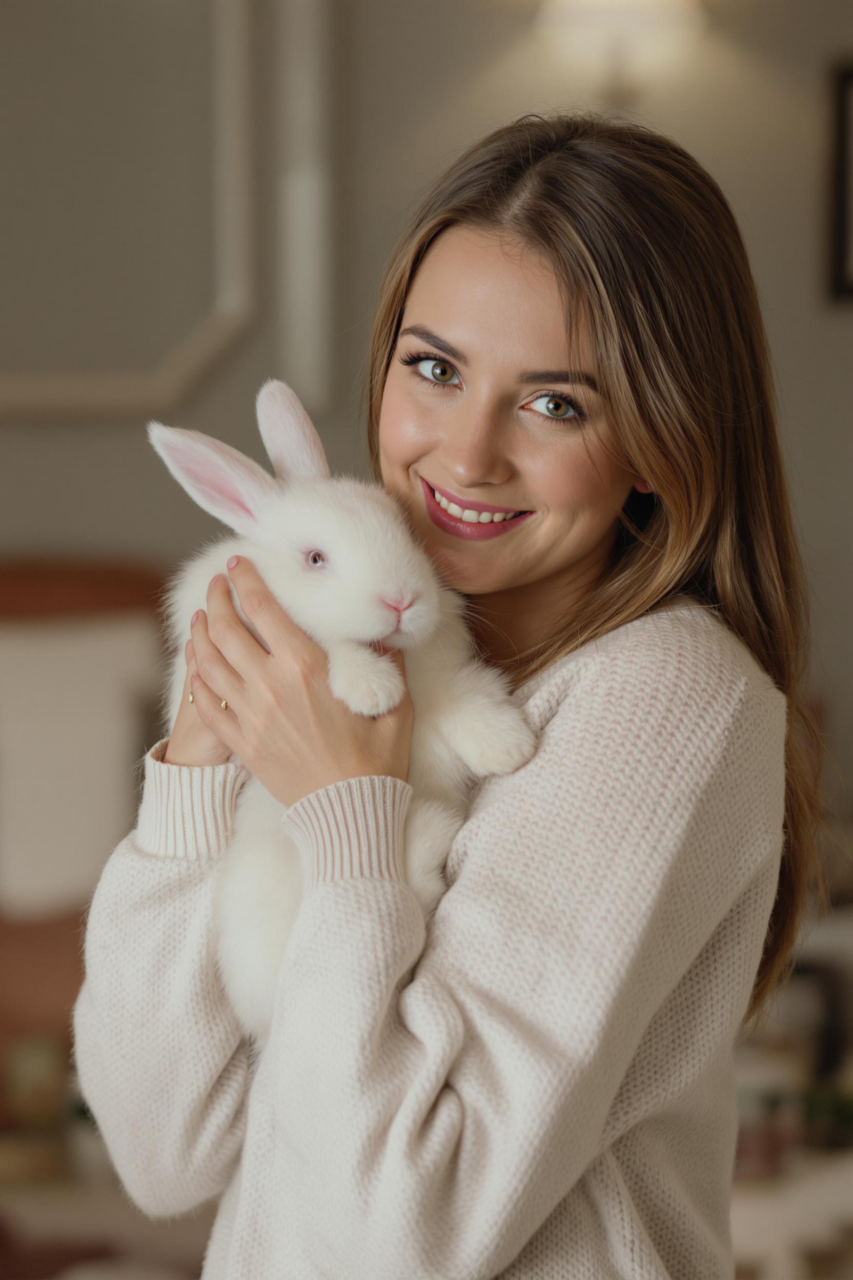 Девушка в светлом свитере весело позирует, держа на руках пушистого белого кролика, на заднем фоне уютная гостиная, мягкий свет, взгляд направлен в камеру, атмосфера уюта и радости.