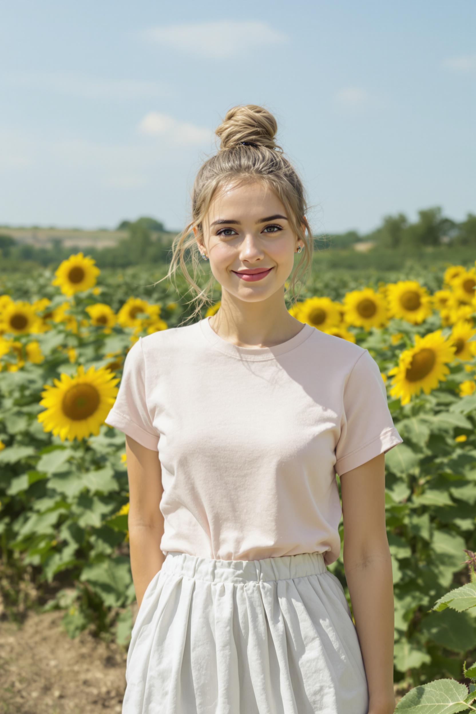 Девушка в светлой льняной юбке и пастельной футболке стоит на фоне поля подсолнухов, её волосы собраны в небрежный пучок. Она смотрит прямо в камеру, на лице лёгкая улыбка. Природный свет подчёркивает свежесть летней атмосферы. Средний план, гармония с природой.