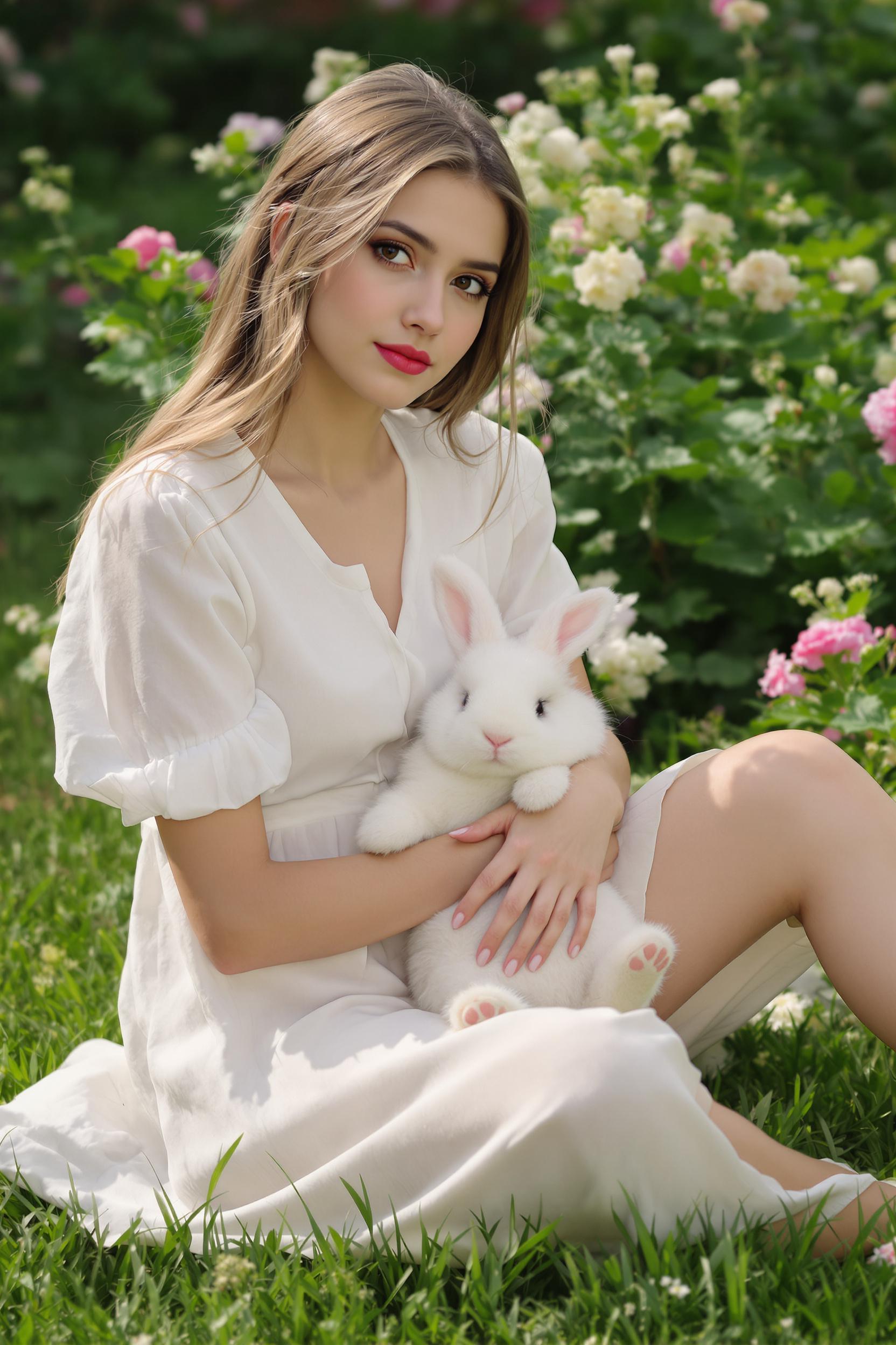 Девушка в светлой одежде сидит на зеленой лужайке, нежно обнимает маленького пушистого кролика, вокруг цветы, мягкий свет, девушка смотрит прямо в камеру, атмосфера уюта и нежности