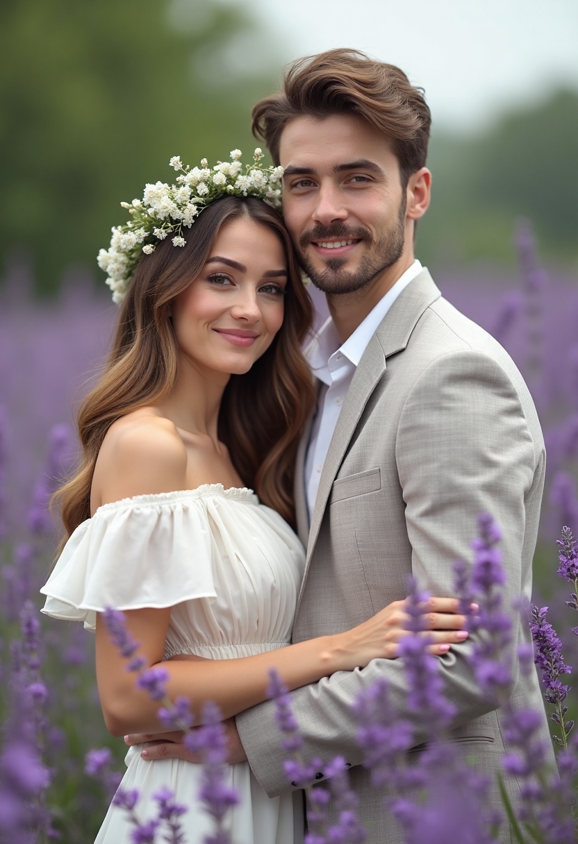 Девушка в воздушном белом платье со слегка открытыми плечами и цветочной диадемой, парень в светлом костюме без галстука. Они стоят в объятиях среди высокой цветущей лаванды, улыбаются и смотрят в камеру, вокруг нежные оттенки сирени и зелени, атмосфера счастья.