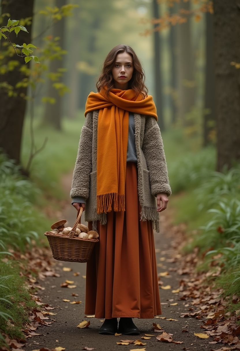 Девушка в ярком платке и длинной юбке стоит на тропинке в лесу, держит корзину с грибами, смотрит прямо в камеру