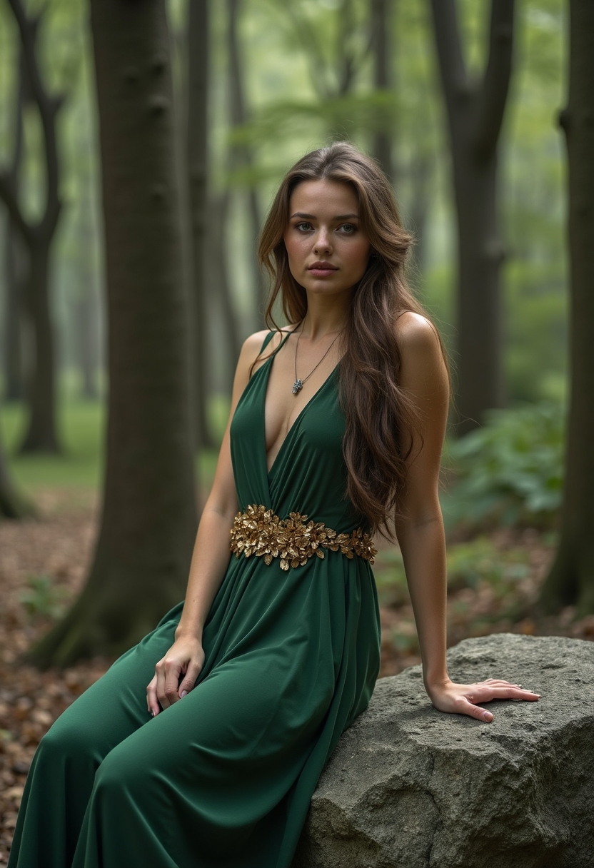 Девушка в зелёном платье с поясом из золотых листьев сидит на большом камне в лесу, вокруг старые деревья, смотрит прямо в камеру