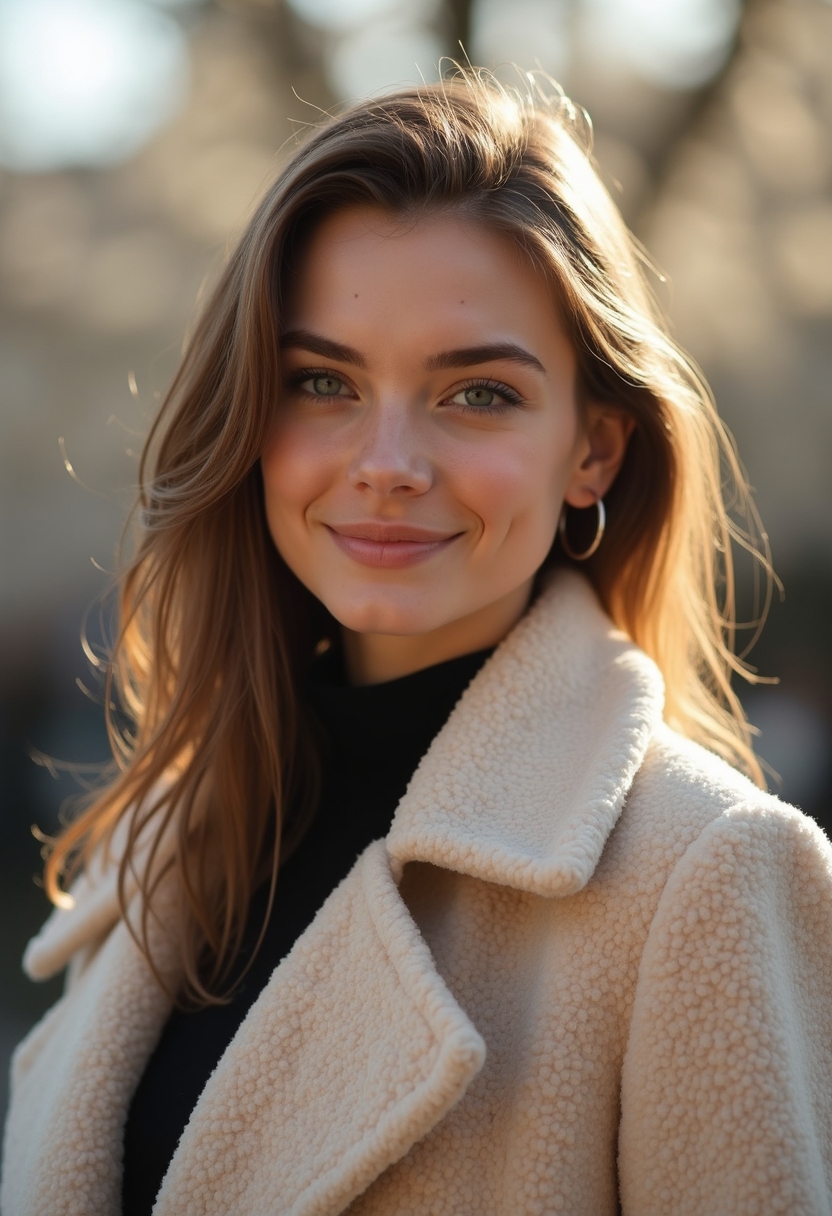 девушка в жемчужном пальто с лёгкой полуулыбкой смотрит прямо в камеру, тёплый утренний свет, рядом цветущий сквер.