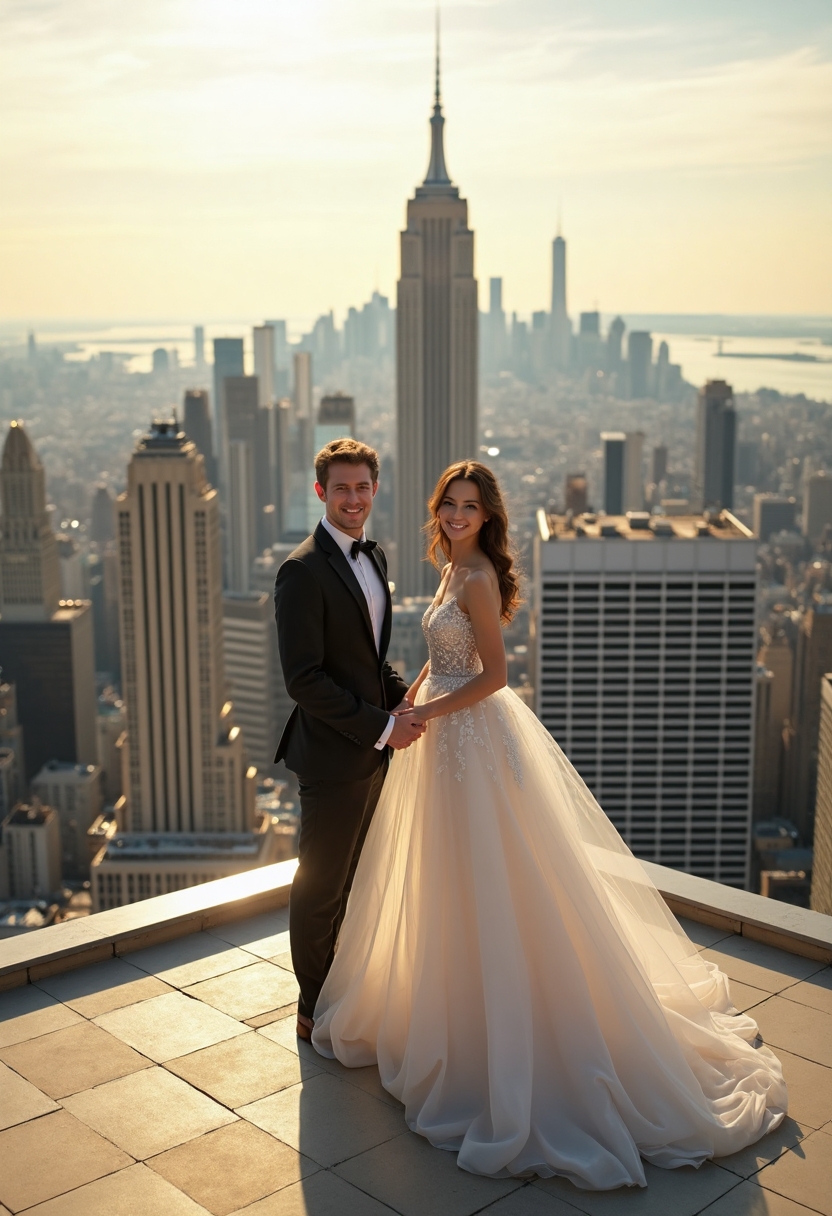 Два человека в изысканных свадебных нарядах стоят рядом на крыше небоскрёба, держась за руки, оба смотрят с радостными лицами в камеру, за их спинами городской пейзаж с сияющими небоскрёбами, яркий дневной свет, атмосфера счастья и любви.