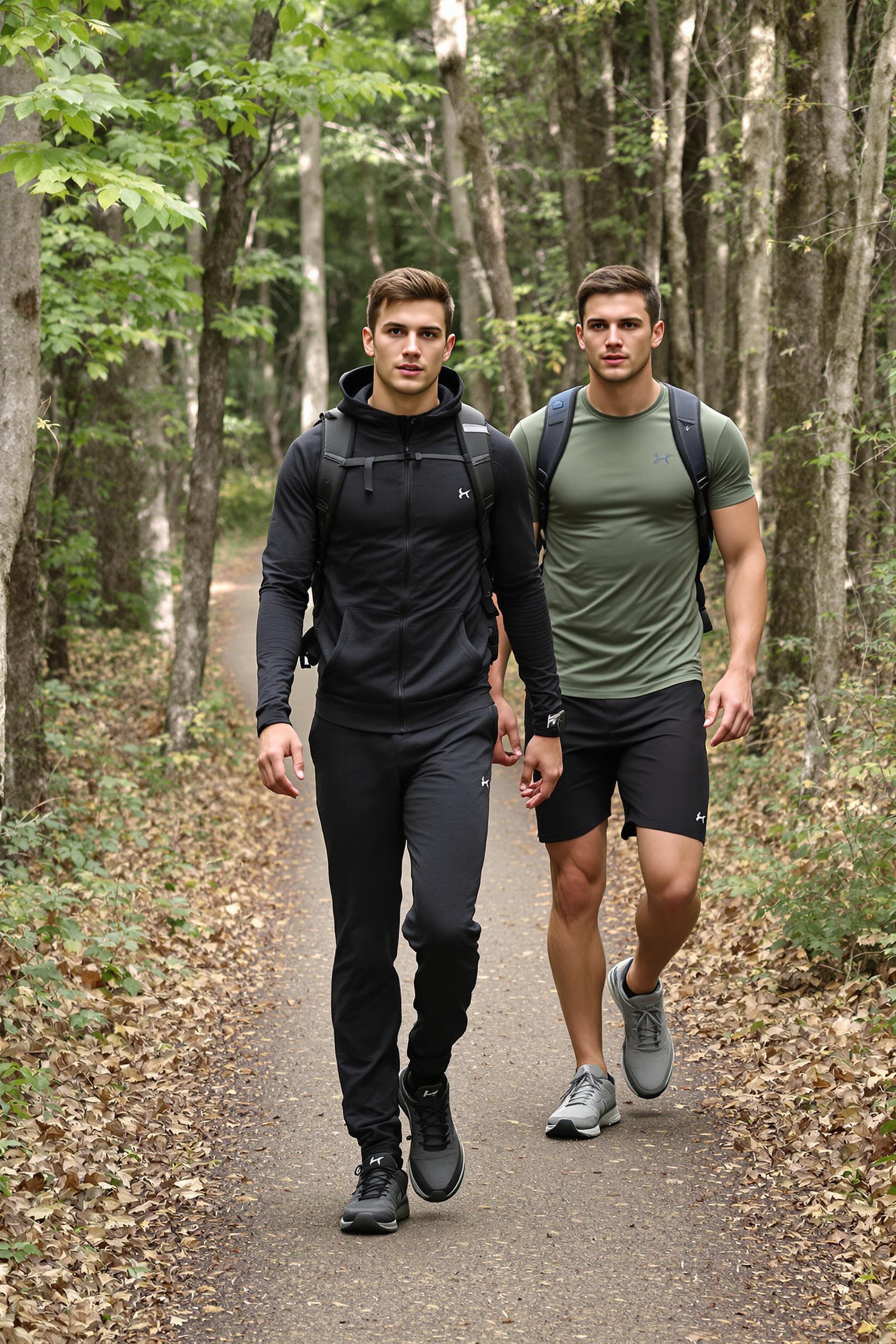 Два молодых мужчины идут по лесной тропинке после тренировки, оба смотрят в камеру. Первый в тёмно-сером спортивном костюме с длинными рукавами и черных кроссовках, второй в зелёной влагоотводящей футболке, черных шортах и серых беговых кроссовках. На плечах спортивные рюкзаки.