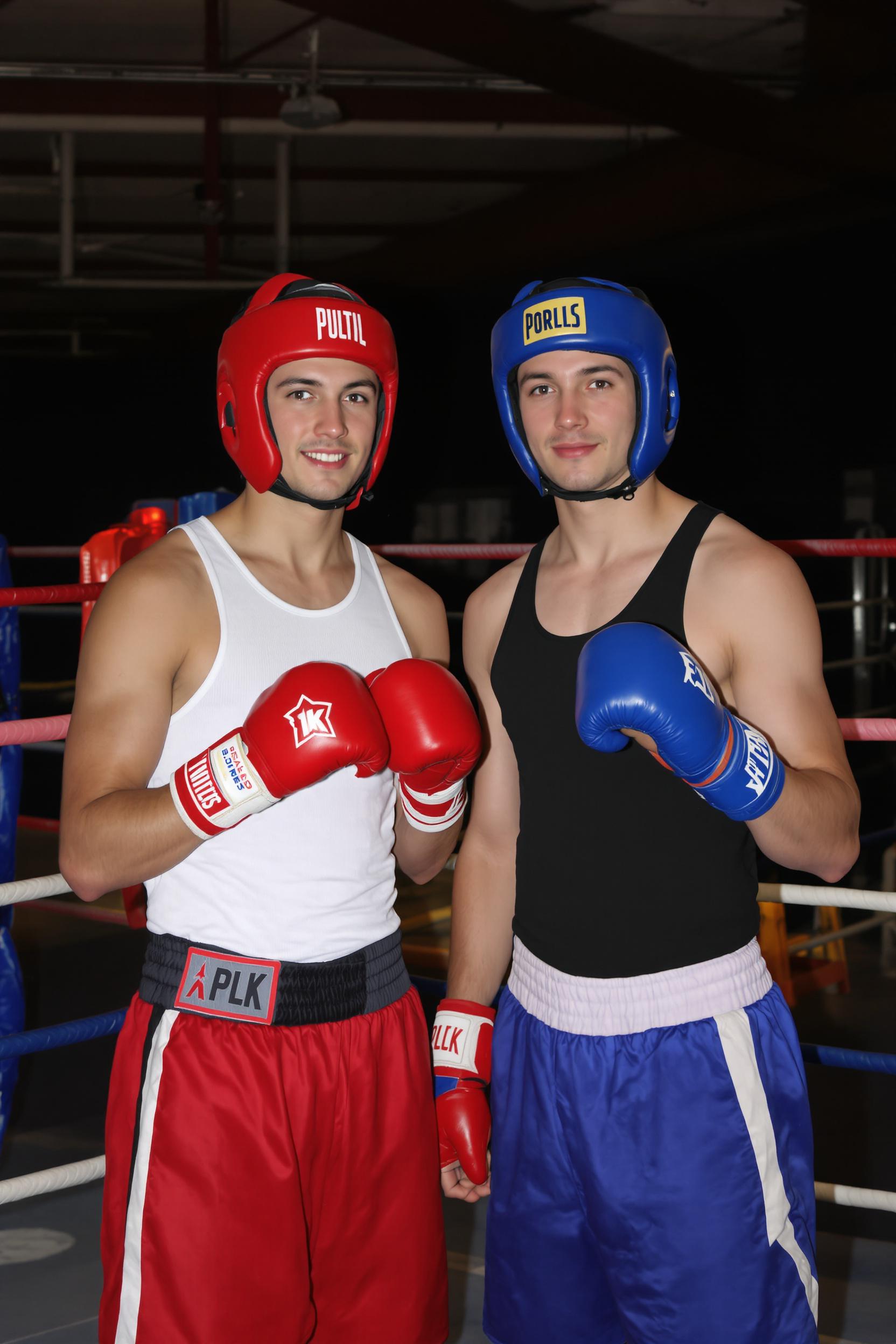 Два молодых мужчины на боксёрском ринге, оба смотрят в камеру с лёгкими улыбками. Первый в красных боксёрских шортах, белой майке, красных перчатках и бинтах, второй в синих шортах, чёрной майке и синих перчатках. У обоих спортивная обувь, видны капы и защитные шлемы.