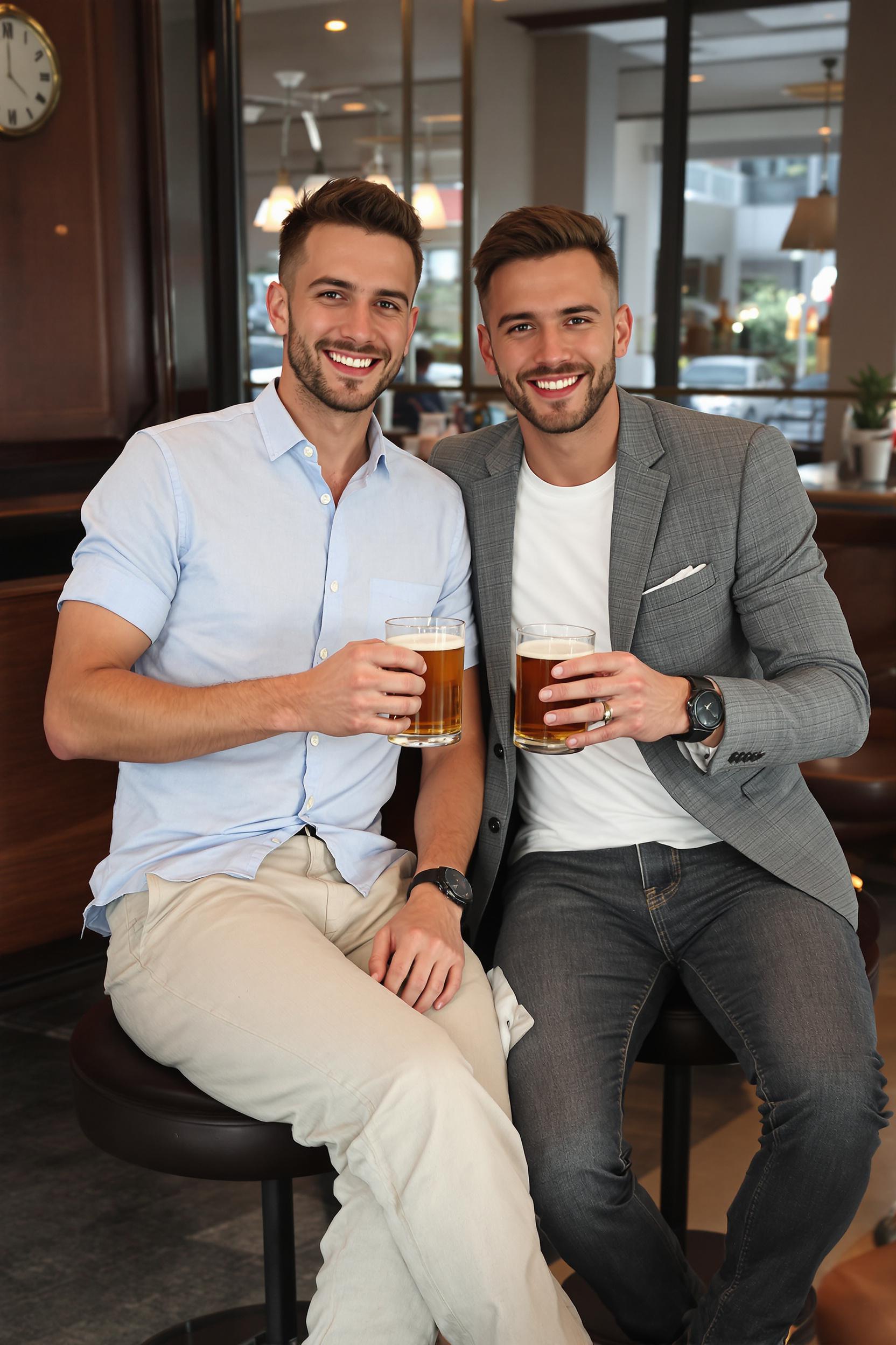 Два молодых мужчины сидят за столиком в баре с кружками пива в руках. Оба смотрят в камеру и улыбаются. Первый в голубой льняной рубашке на пуговицах и светло-бежевых брюках, второй в сером пиджаке, белой футболке и тёмных джинсах, стильные часы на руке.