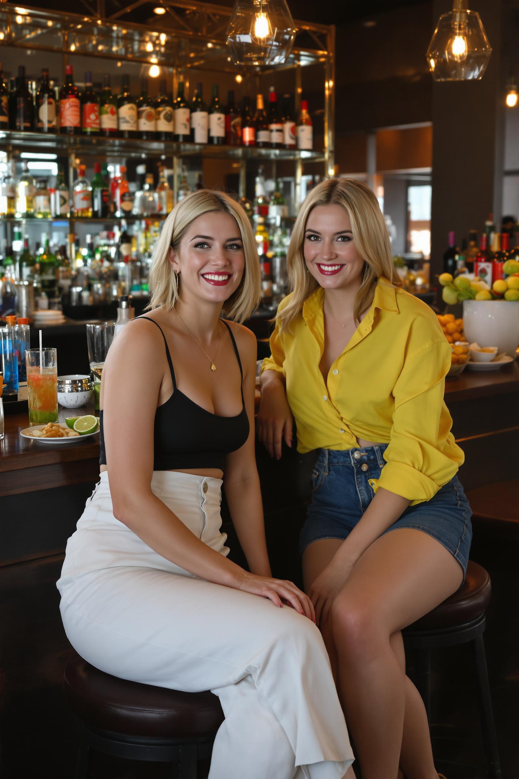 Две девушки сидят за барной стойкой, обе смотрят в камеру и смеются. Первая в чёрном топе на тонких бретелях и высоких белых брюках, вторая в короткой джинсовой юбке и ярко-жёлтой рубашке навыпуск. Перед ними коктейли и закуски, атмосфера уюта в баре.