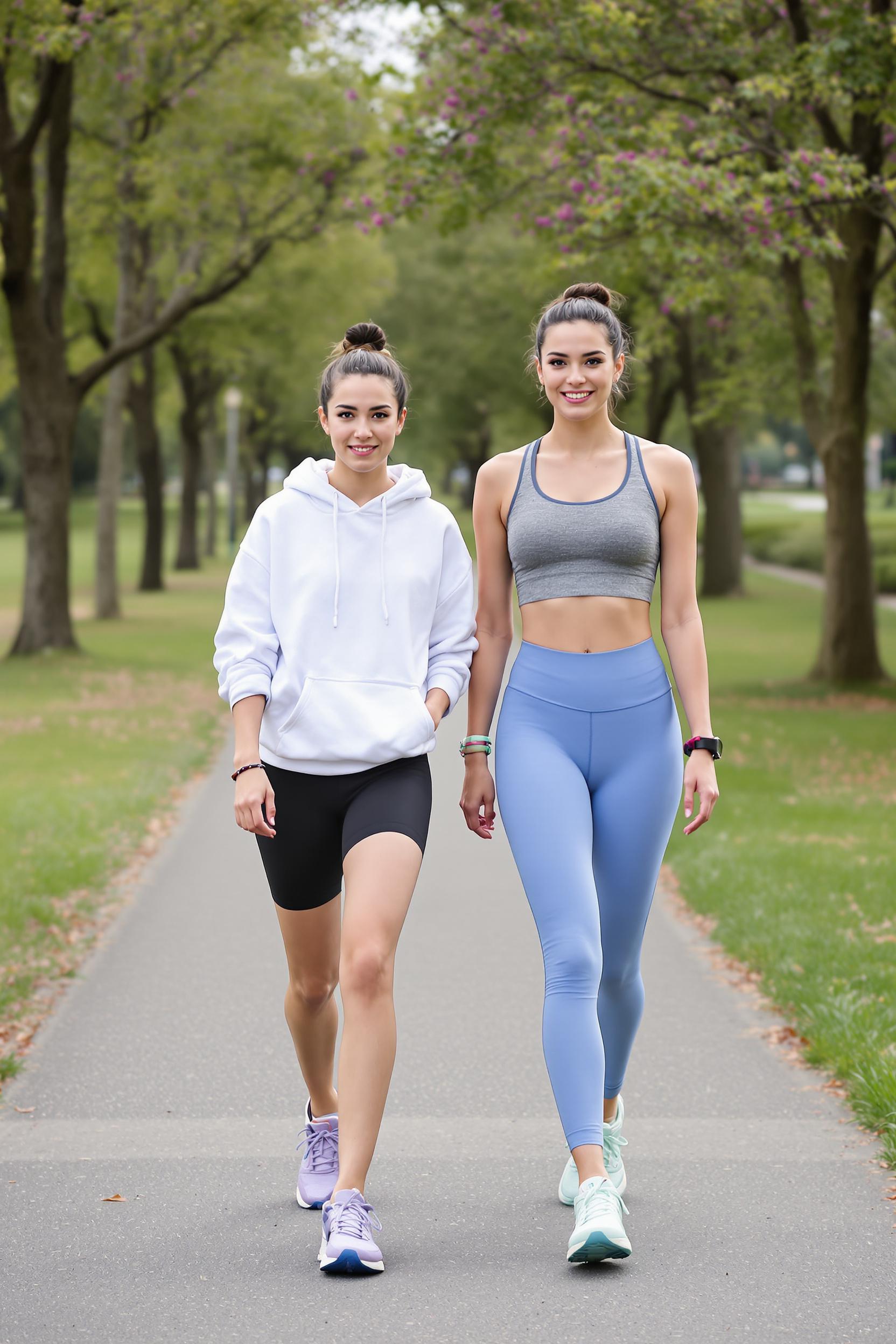 Две девушки после тренировки идут по парковой дорожке, обе смотрят в камеру с лёгкими улыбками. На одной чёрные велосипедки, белый оверсайз-худи и лавандовые кроссовки, вторая в коротком сером спортивном топе, синих леггинсах и мятных беговых кроссовках. Волосы собраны в пучки, у обеих фитнес-браслеты.