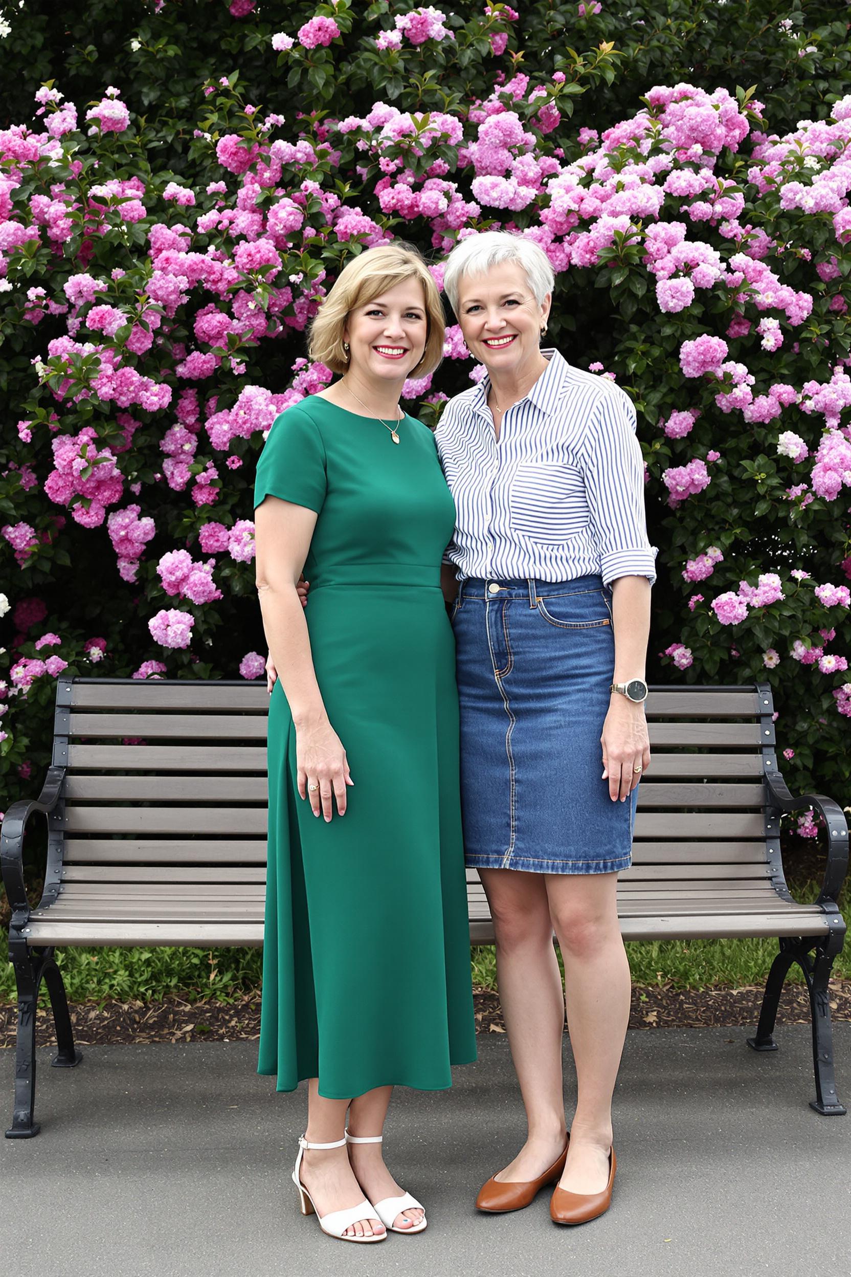 Две подруги средних лет стоят в обнимку на фоне парковый скамейки и цветущих кустов, обе смотрят в камеру. Одна в изумрудном платье-миди и белых босоножках, вторая в джинсовой юбке, полосатой рубашке и коричневых балетках. Лёгкие улыбки, расслабленные позы.