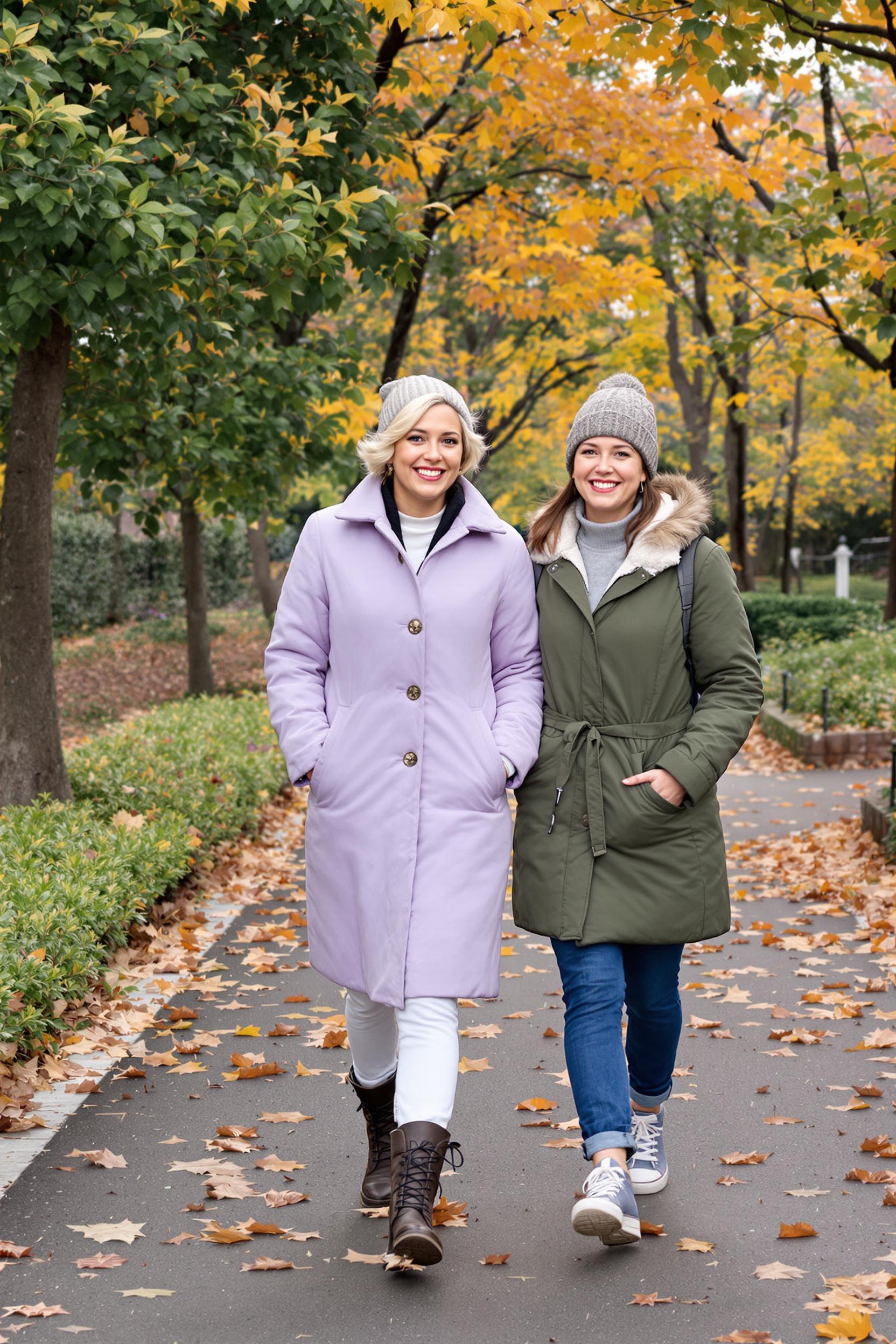 Две женщины разного возраста идут по аллее городского парка, обе смотрят в камеру и улыбаются. Одна в длинном сиреневом пальто, белых брюках и тёмных ботинках, другая в зелёной парке, голубых джинсах и светлых кедах, вязаная шапка. Осенняя листва вокруг.