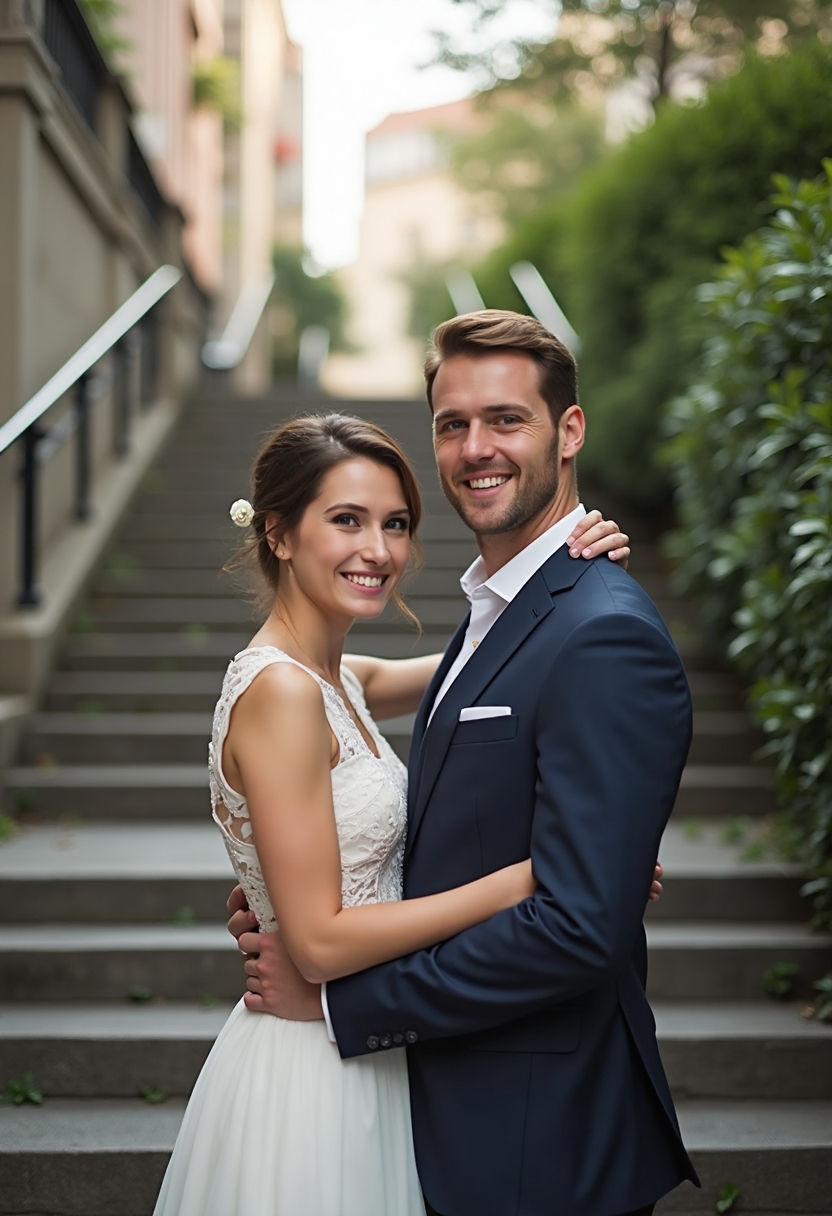 Двое молодожёнов стоят на фоне городской лестницы, обнявшись за плечи, оба смотрят в камеру с искренними улыбками, вокруг городская зелень и архитектурные элементы, утренний рассеянный свет, атмосфера счастья и гармонии.