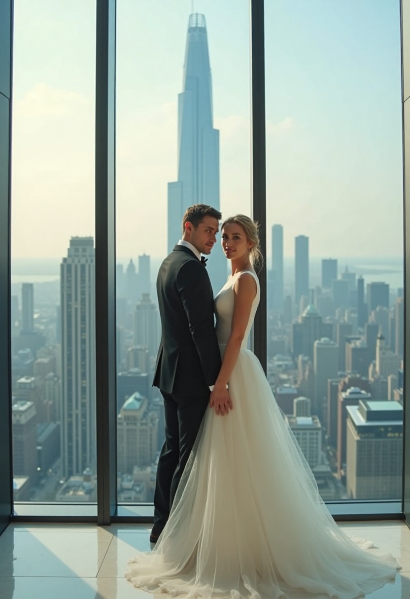Двое молодожёнов в элегантных свадебных нарядах стоят рядом, держатся за руки, смотрят прямо в камеру, позади впечатляющий стеклянный небоскрёб и панорама города, воздух наполнен светом и ощущением романтики на высоте.
