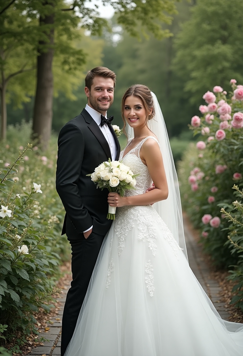 Двое молодожёнов в элегантных свадебных нарядах стоят в среднерусском саду, окружённые пышными цветущими кустами. Они обнимаются за плечи, оба счастливо смотрят прямо в камеру, в руках у одного из них нежный букет, атмосфера гармонии и влюблённости.