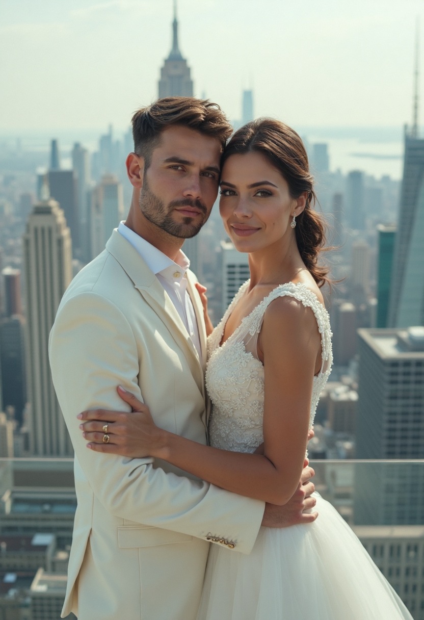 Двое молодожёнов в стильных свадебных нарядах стоят на крыше небоскрёба, слегка обнявшись за талию, оба смотрят в камеру, позади панорама современного города с высотками, свежий дневной свет, атмосфера возвышенности и влюблённости.