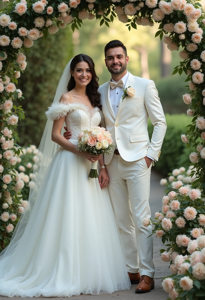 Двое молодожёнов в утончённых белых свадебных нарядах стоят рядом среди множества живых цветов на свежем воздухе, держатся за руки, оба счастливы и улыбаются, смотрят прямо в камеру. Вокруг цветущая арка и зелёные насаждения, лёгкий дневной свет.