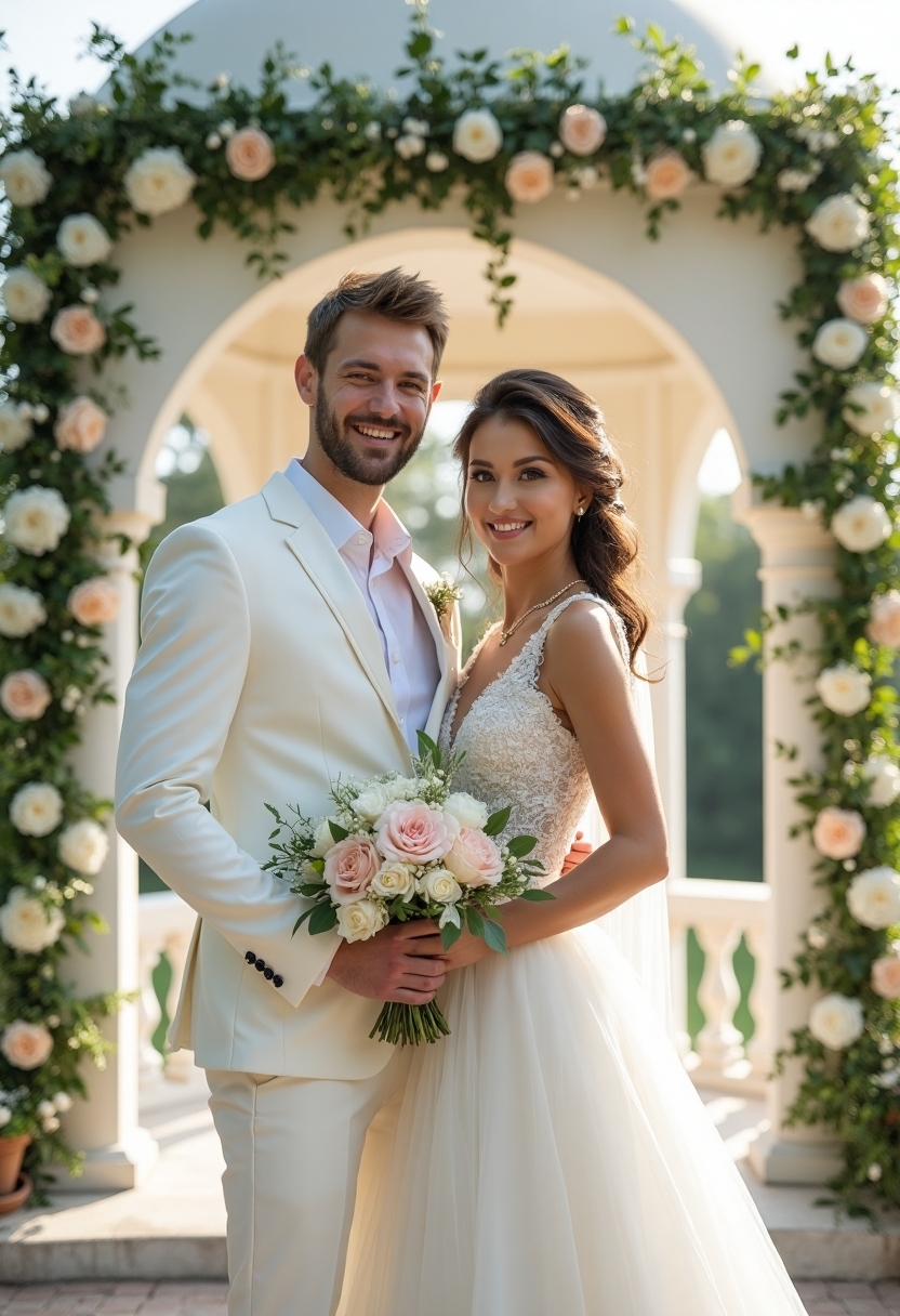 Двое молодожёнов в утончённых свадебных нарядах стоят на фоне белой ротонды, украшенной живыми цветами и зелёными гирляндами, держась за руки и смотря в камеру, в руках нежный букет, лица светятся радостью, дневное мягкое освещение.