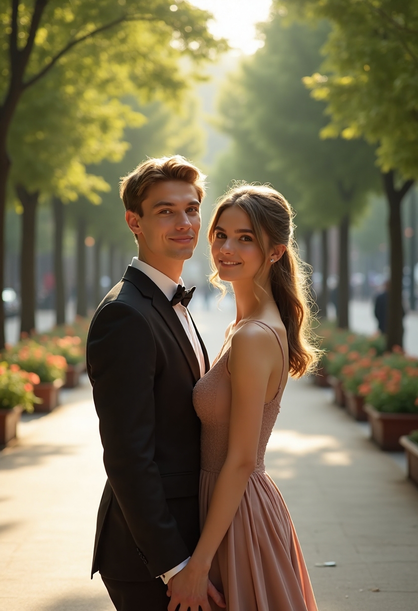 Двое молодых людей в элегантных нарядах стоят рядом, держатся за руки и смотрят в камеру, на фоне городского парка с зелёными аллеями и цветочными клумбами, утренний свет, лёгкая романтическая атмосфера