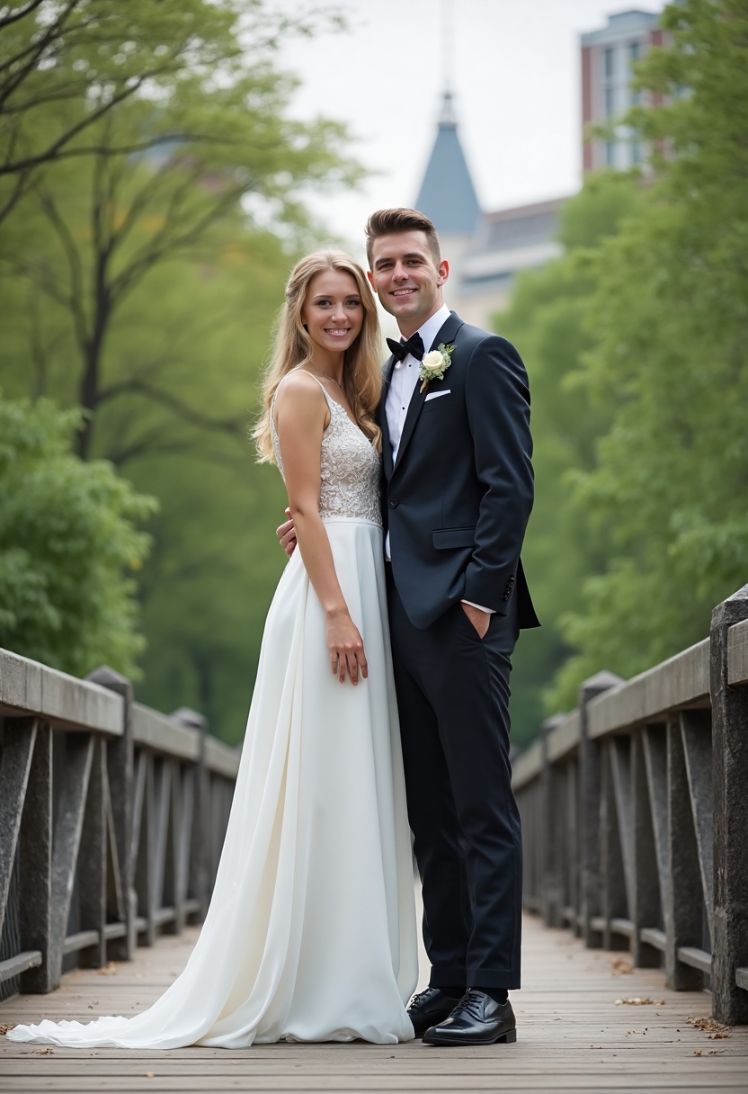Двое молодых людей в свадебных образах стоят бок о бок на мосту в городском парке, между ними лёгкий контакт плечами, оба смотрят в камеру с тёплыми улыбками, вокруг зелень и городской пейзаж, дневной свет, гармоничная композиция.