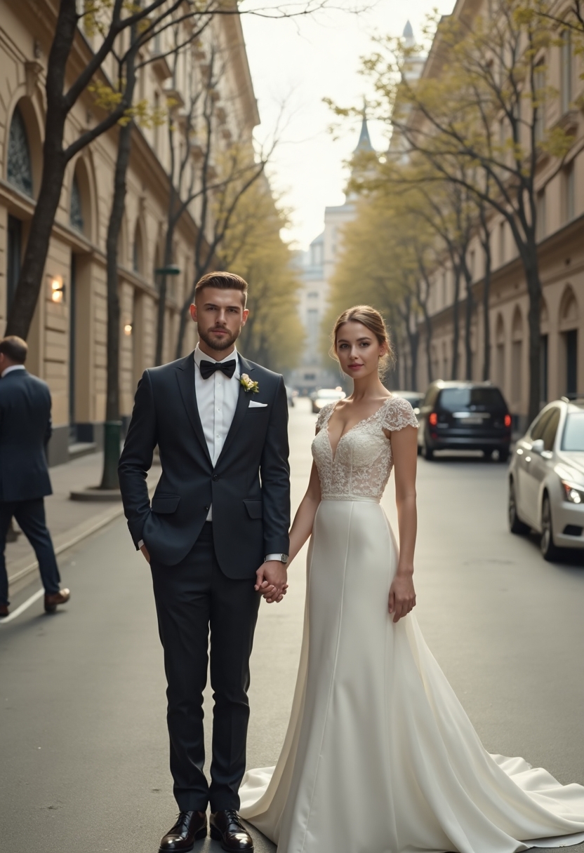 Двое молодых людей в утончённых свадебных нарядах стоят рука об руку на фоне старинной городской улицы с архитектурными элементами, оба смотрят с любовью в камеру, вокруг лёгкий городской трафик и элегантные деревья, мягкий дневной свет.