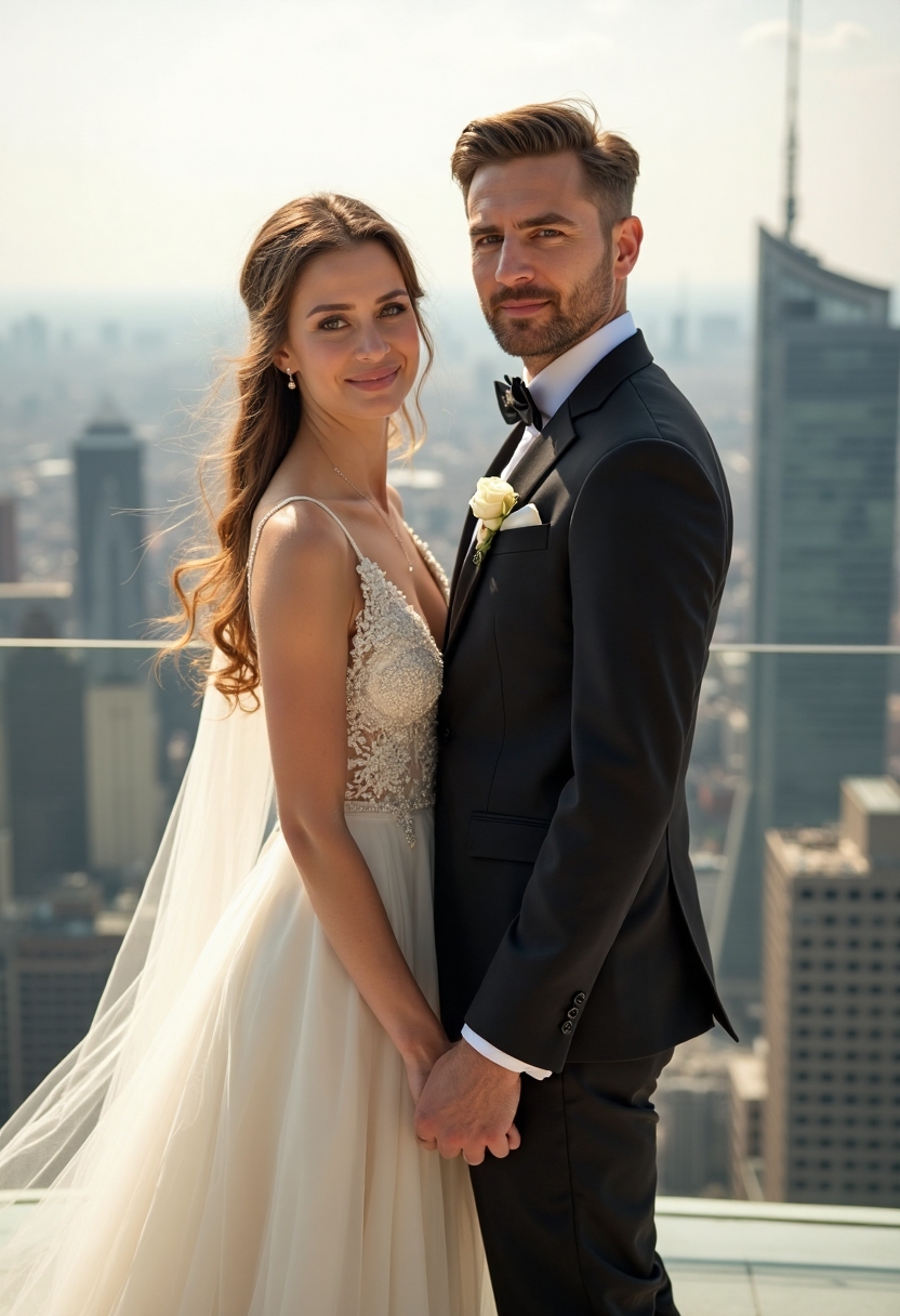 Двое влюблённых в элегантных свадебных нарядах стоят рядом на открытой крыше небоскрёба, держатся за руки, оба смотрят прямо в камеру, позади размытый городской панорамный вид, на лицах счастье, тёплый дневной свет, современные высотки.