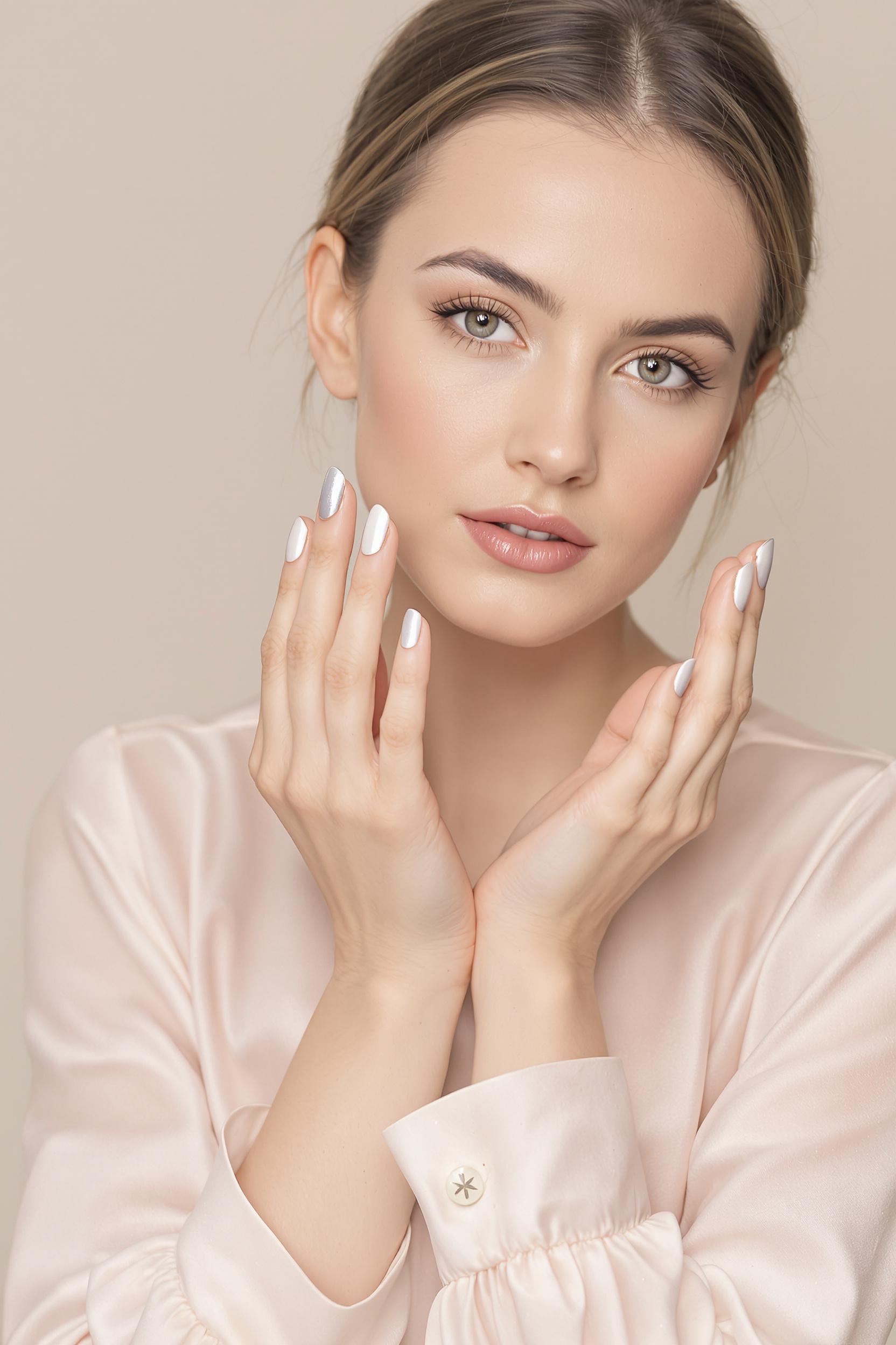 Элегантная женщина-мастер маникюра в нежной блузе позирует на средний план. Она уверенно смотрит в камеру, ладони с минималистичным серебряным дизайном ногтей плавно обрамляют лицо, акцент на четких чертах лица и бликах лака, нейтральный фон.