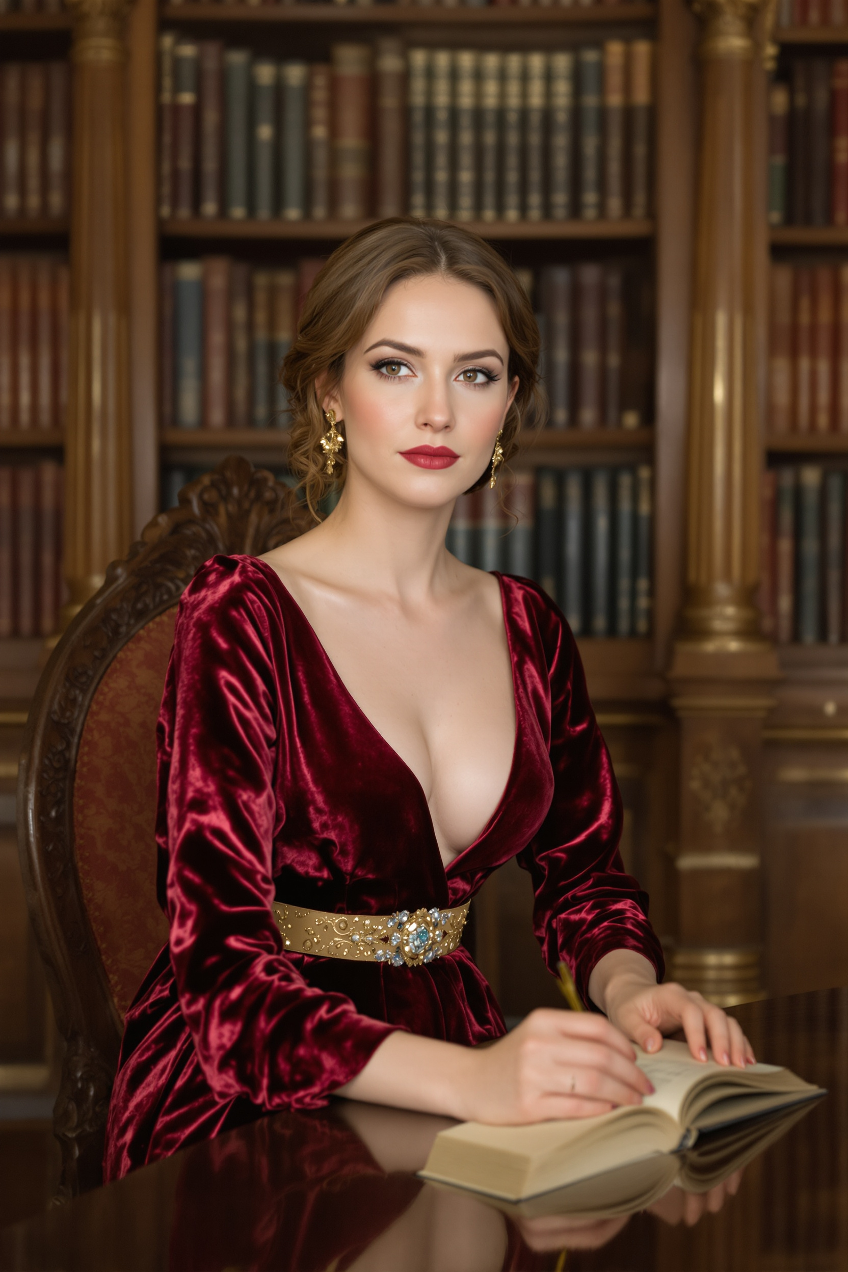 Элегантная женщина в изящном бархатном платье цвета бордо, украшенном золотым поясом, сидит за массивным деревянным столом с книгой в руках, на фоне старинной библиотеки дворца. Женщина смотрит прямо в камеру, атмосфера роскоши и уюта.