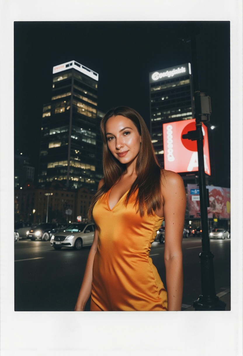 Фото в стиле Полароид с белой рамкой — женщина в шёлковом платье стоит на фоне ночного города, вокруг огни высоток и неоновая вывеска