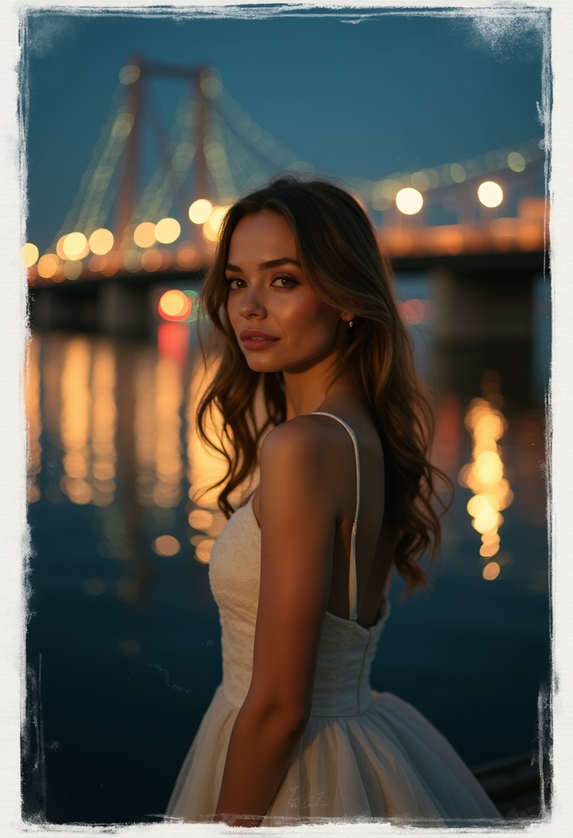 Фото в стиле Полароид с белой рамкой — женщина в вечернем платье стоит у реки, за спиной мост с яркой подсветкой и отражение в воде